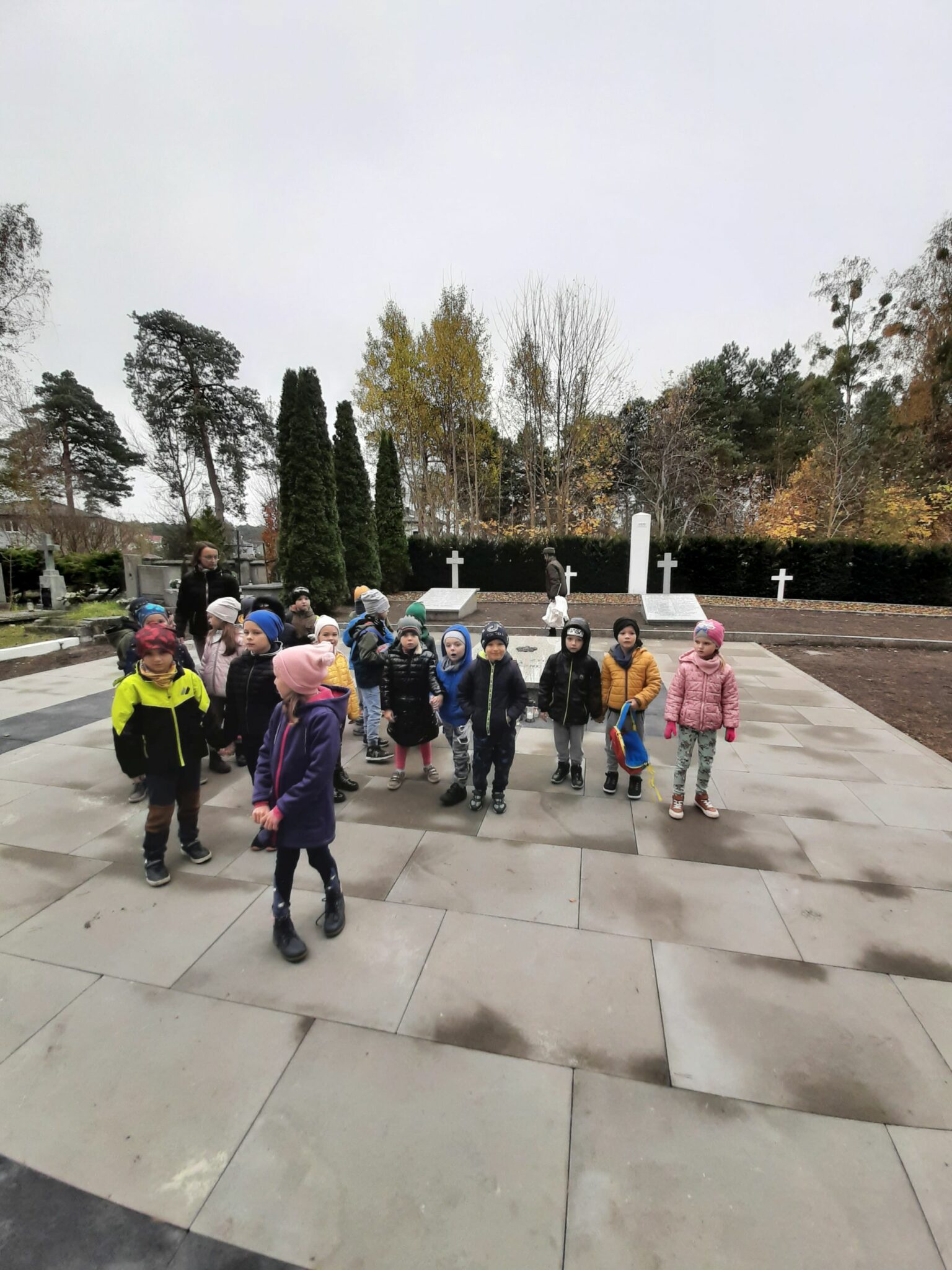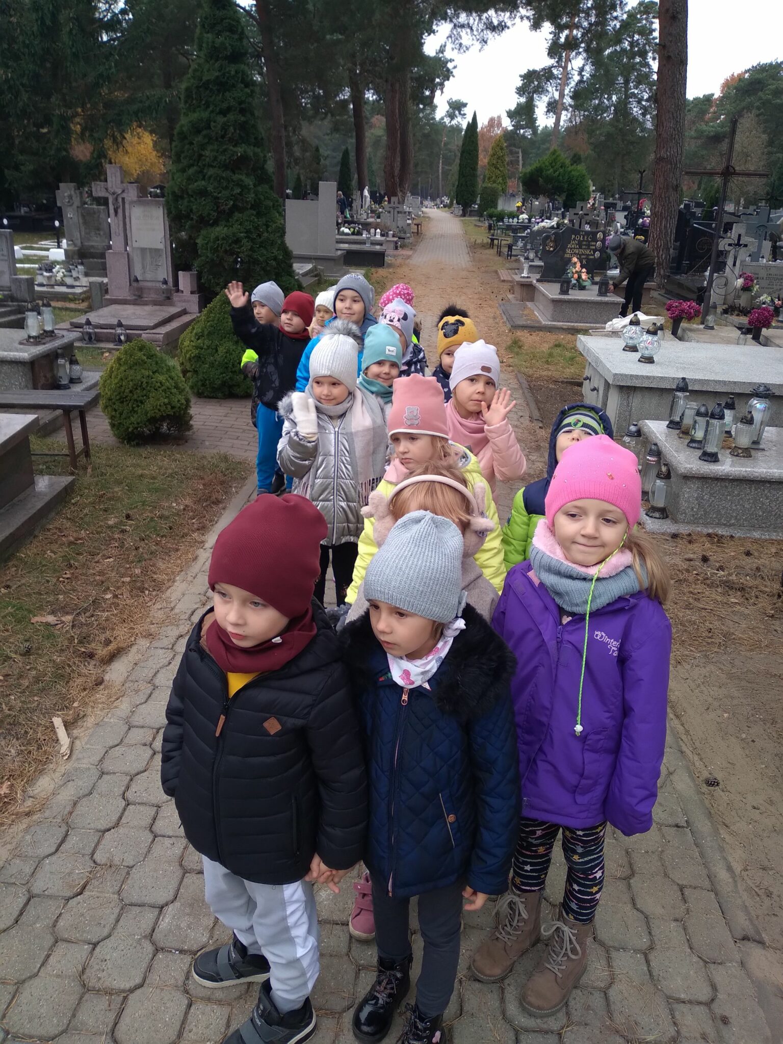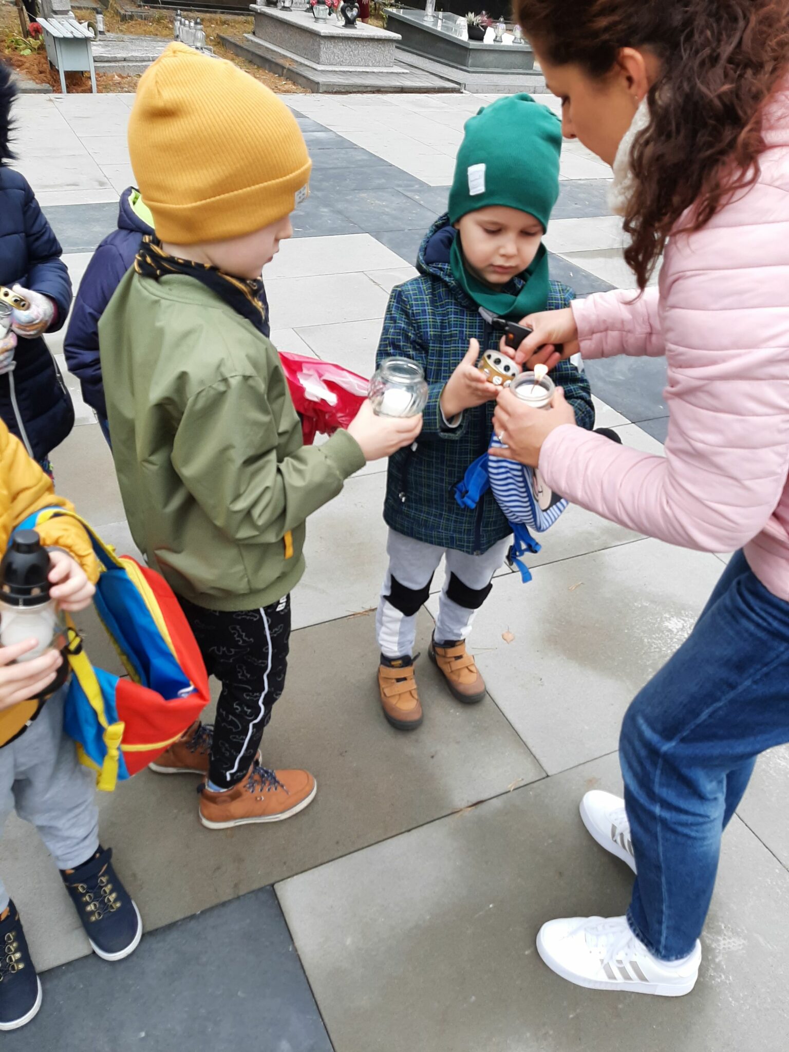 W naszym przedszkolu uczymy dzieci okazywania szacunku osobom, które od nas odeszły, pokazujemy także to, jak ważne jest zachowanie o nich pamięci. W dniu 28 października dzieci z grup Krasnoludki, Żabki i Delfiny wzięły udział w wycieczce na Cmentarz w Kozienicach. Dzieci zapaliły symboliczny znicz na Grobie Nieznanego Żołnierza, oddając tym samym hołd pamięci poległym żołnierzom podczas walk o wolność Polaków. Spacer alejkami cmentarza był dla dzieci ogromnym przeżyciem.