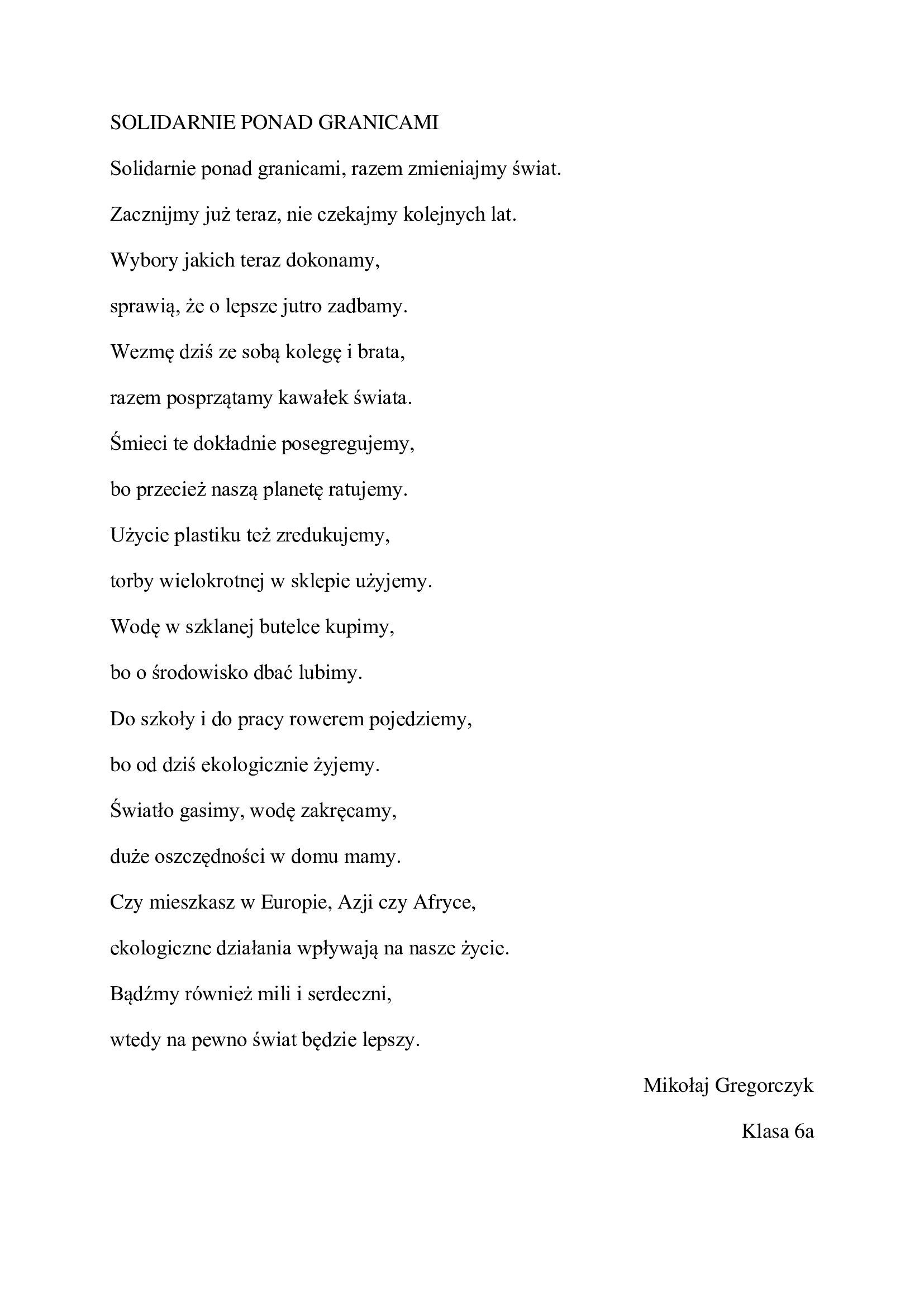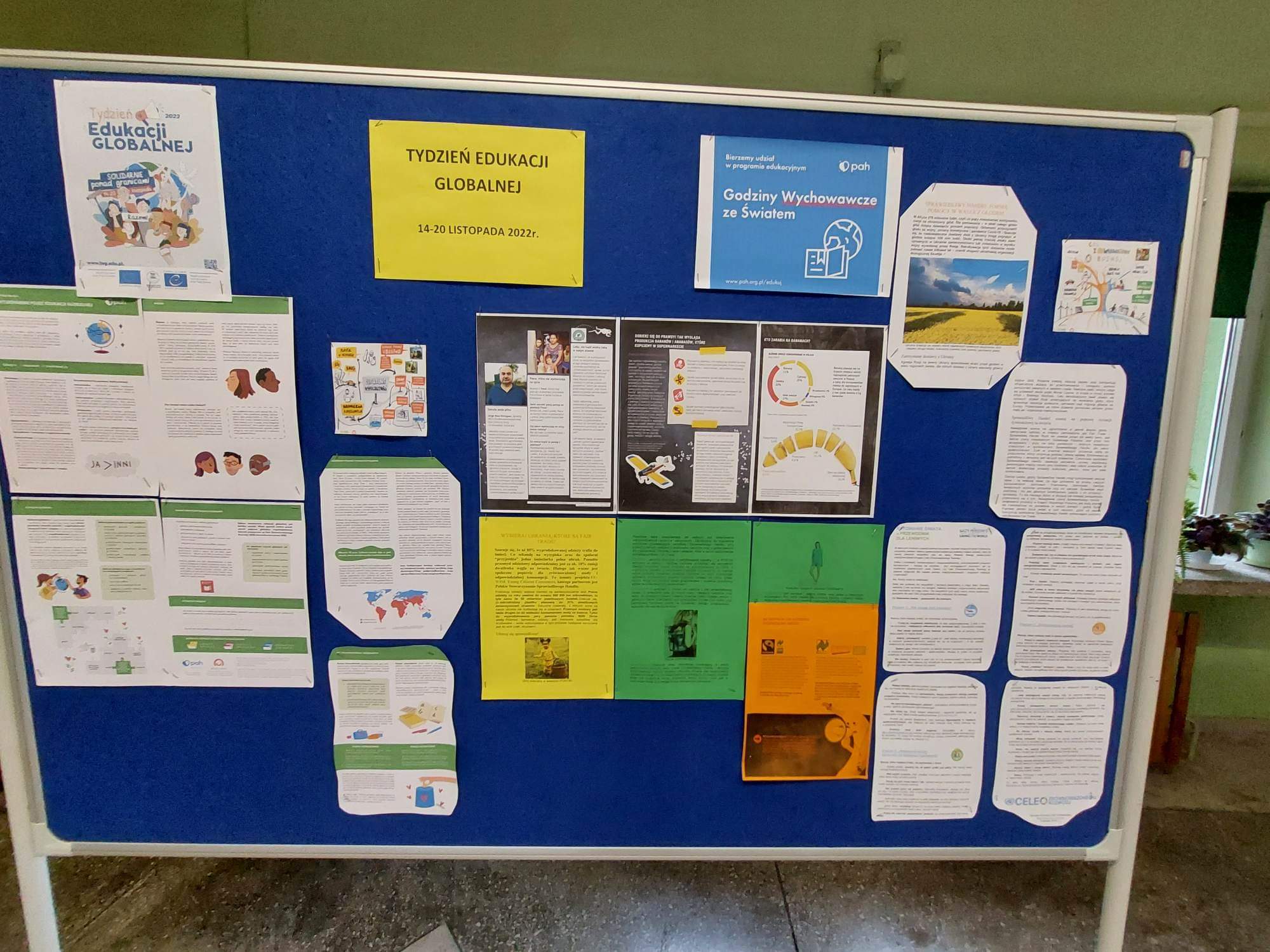 Tegoroczny Tydzień Edukacji Globalnej odbywał  się pod hasłem „Solidarnie ponad granicami” i w całej Europie był  obchodzony w dniach od 14 do 20 listopada 2022r.   Z tej okazji  w naszej placówce odbył się konkurs pt.” Solidarnie ponad granicami”.  Prace uczniów  zwracały uwagę na wpływ naszych codziennych powiązań i wyborów na funkcjonowanie ludzi poza naszymi granicami ( np. zanieczyszczenie środowiska- odpady, zanieczyszczenie powietrza, konsumpcja itd.) Tematyka Tygodnia była również poruszana  przez nauczycieli na szeregu zajęć lekcyjnych. Celem tych działań było zwiększenie świadomości konsumenckiej  poprzez częstsze zwracanie uwagi na pochodzenie, sposób wytwarzania i sprzedaży jadanych na co dzień produktów spożywczych. Ten prosty nawyk – czytania informacji znajdujących się na opakowaniach oraz oznaczeniach produktów na półkach sklepowych, a także wyszukiwania o nich informacji w Internecie, będzie  pozytywnie wpływał  na życie ludzi w innych częściach świata. Organizatorami TEG była Panie  Anna Janowska i Iwona Bitner.