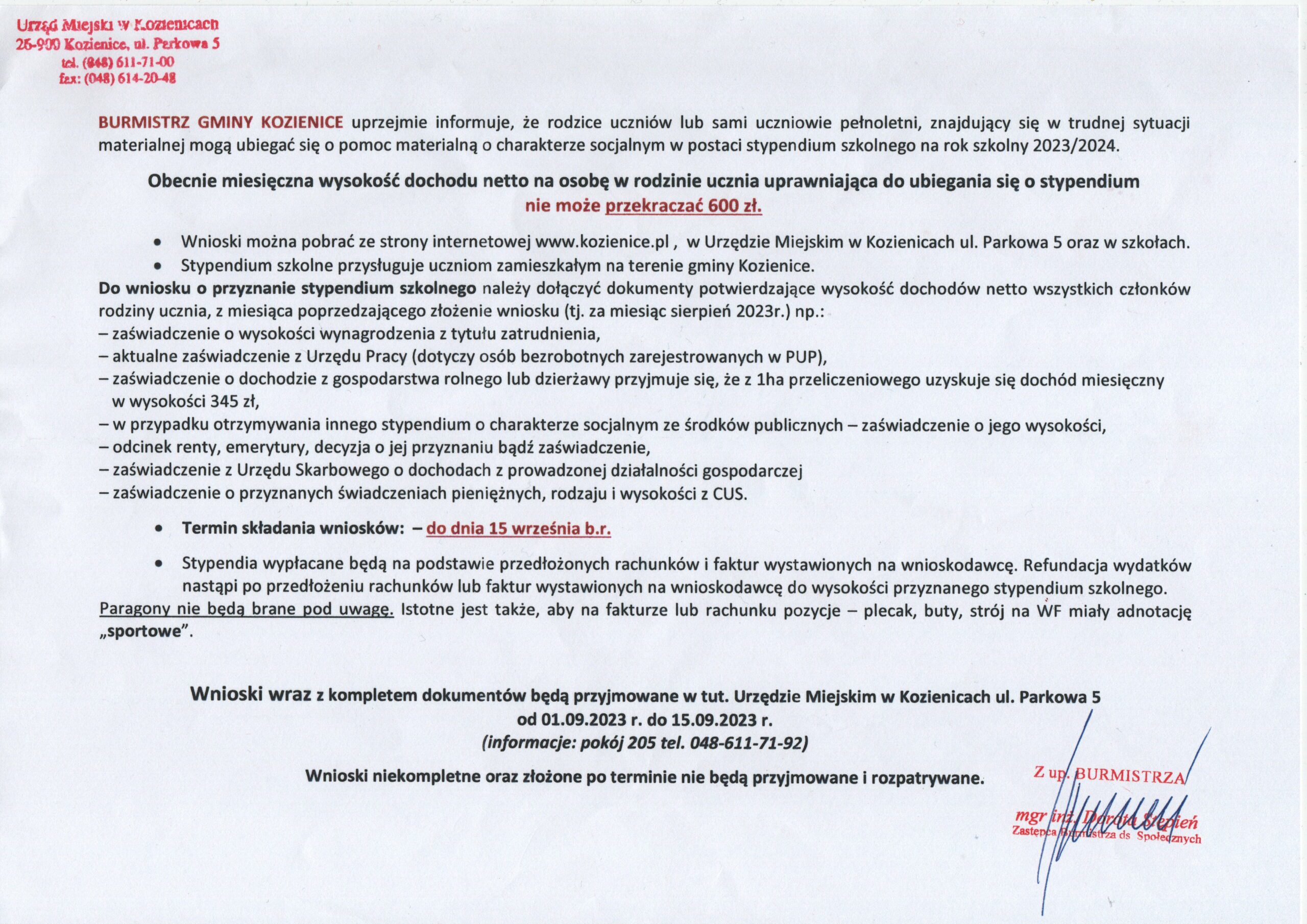 Stypendium szkolne o charakterze socjalnym na rok szkolny 2023/2024