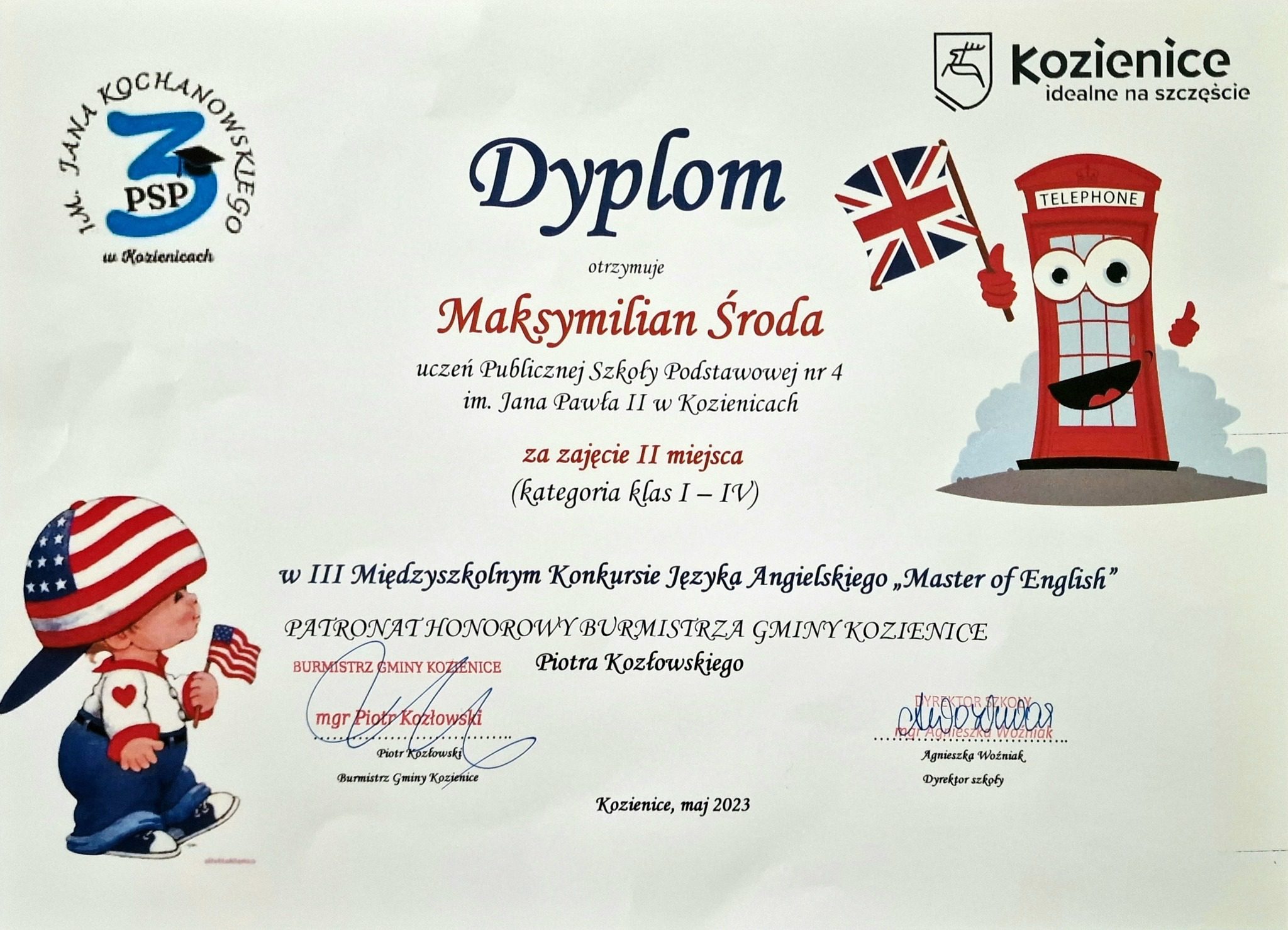 Jest nam niezmiernie miło poinformować, że uczeń naszej szkoły Maksymilian Środa zdobył II miejsce (kategoria klasy 1-4) w III Międzyszkolnym Konkursie Języka Angielskiego „Master of English”