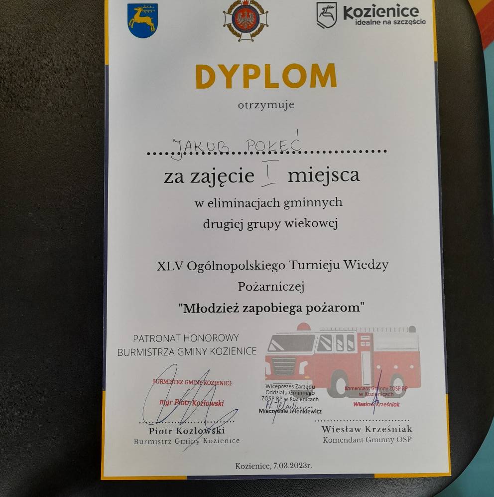 W wyniku rozgrywek finałowych, w których brało udział w tej kategorii wiekowej ponad 40-u uczniów, I miejsce zajął Jakub Połeć. Reprezentować on będzie naszą szkołę w następnym etapie na szczeblu powiatowym, które odbędą się w Państwowej Powiatowej Straży Pożarnej w Kozienicach.
