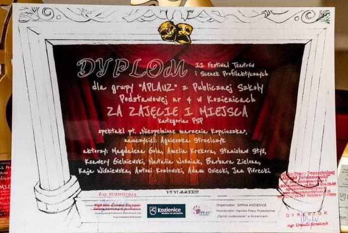 Teatrzyk ,, Aplauz” z klasy 2a zajął 1miejsce z przedstawieniem ,, Niespełnione marzenia Kopciuszka”