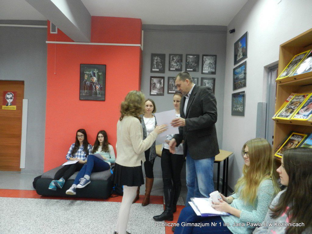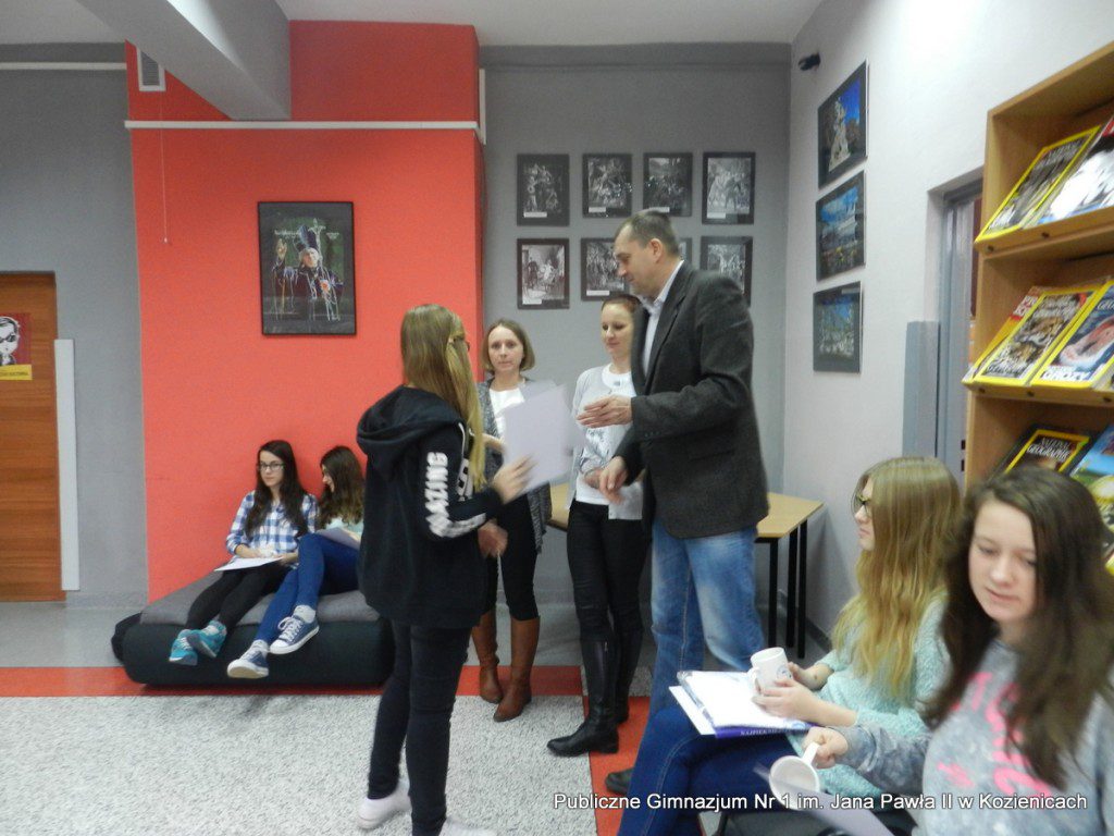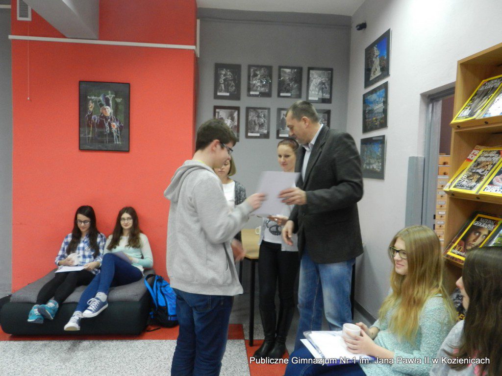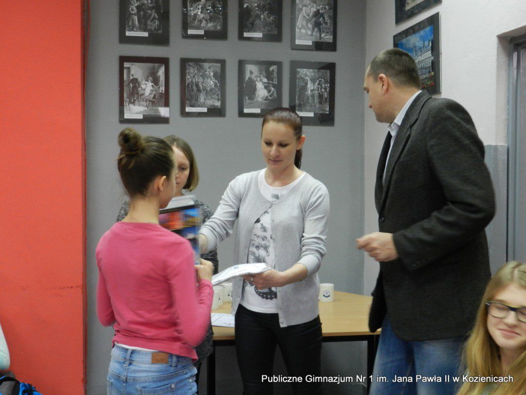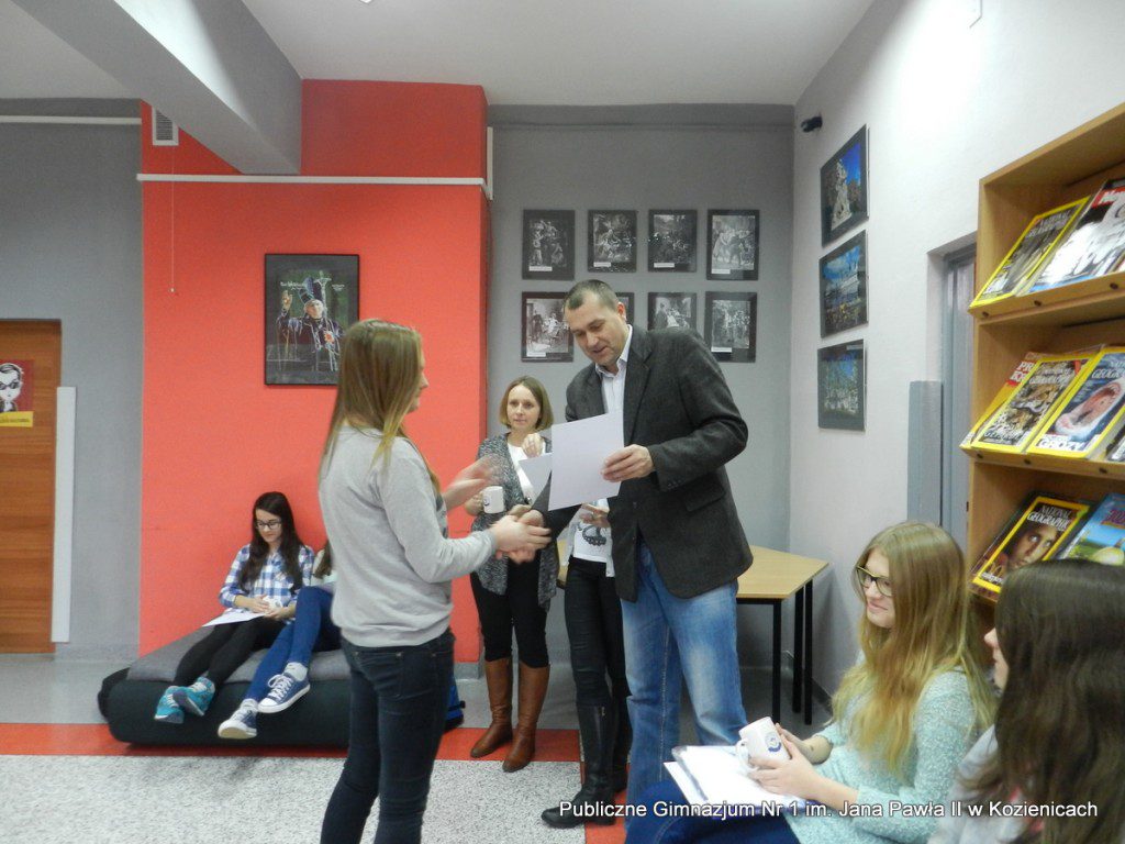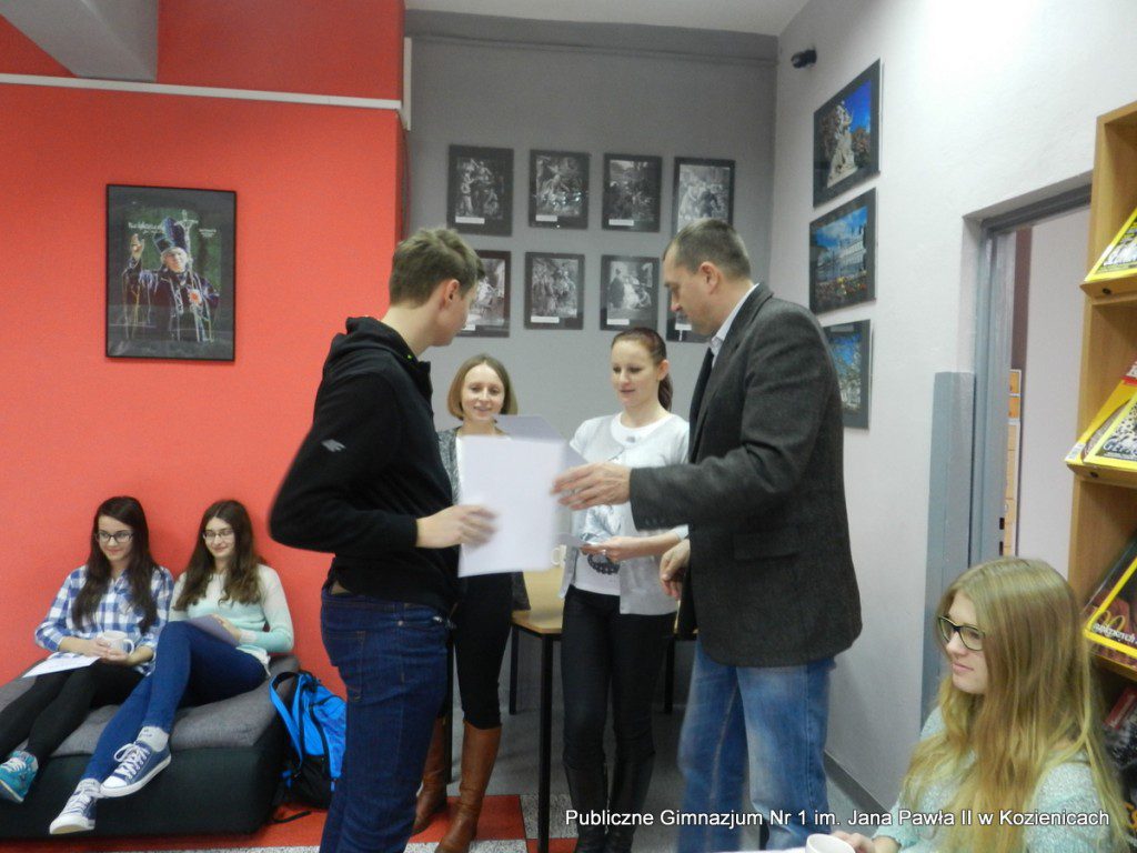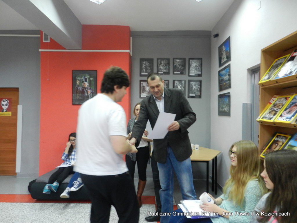 Nagrody wręczył zwycięzcom dyrektor Publicznego Gimnazjum Nr 1 im. Jana Pawła II w Kozienicach pan Tomasz Trela, wszystkim finalistom gratulował dobrych wyników i życzył dalszych sukcesów. Laureaci konkursu otrzymali pamiątkowe dyplomy, kubeczki z logo szkoły oraz nagrody książkowe i koszulki.