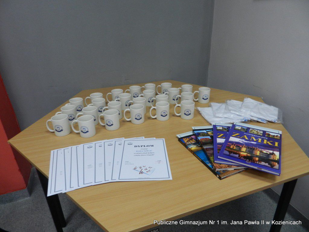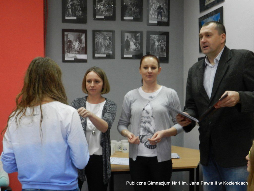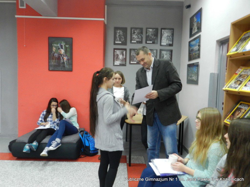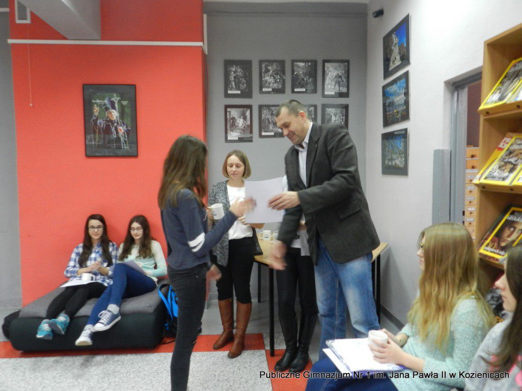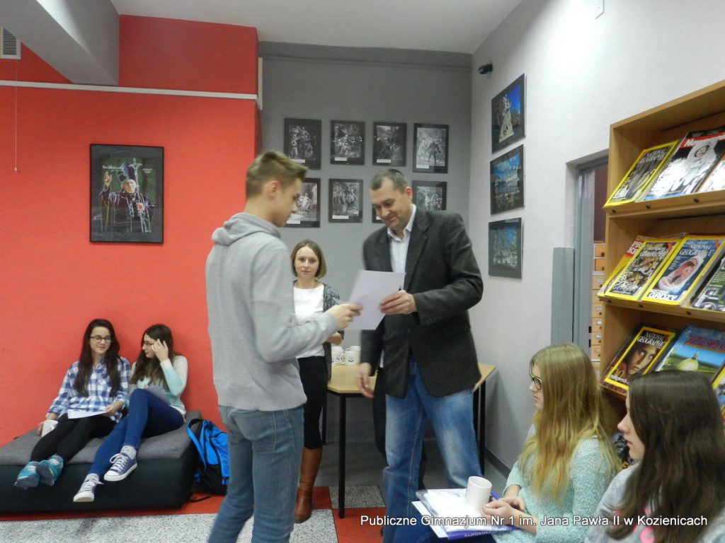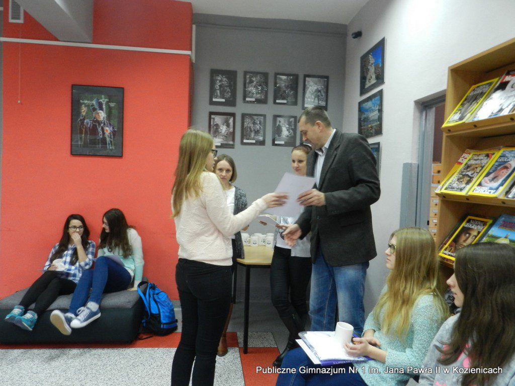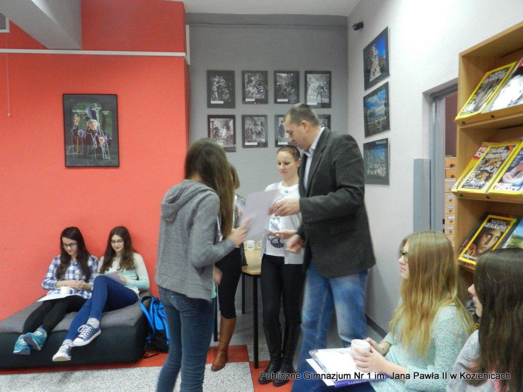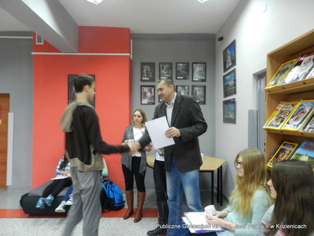 Nagrody wręczył zwycięzcom dyrektor Publicznego Gimnazjum Nr 1 im. Jana Pawła II w Kozienicach pan Tomasz Trela, wszystkim finalistom gratulował dobrych wyników i życzył dalszych sukcesów. Laureaci konkursu otrzymali pamiątkowe dyplomy, kubeczki z logo szkoły oraz nagrody książkowe i koszulki.