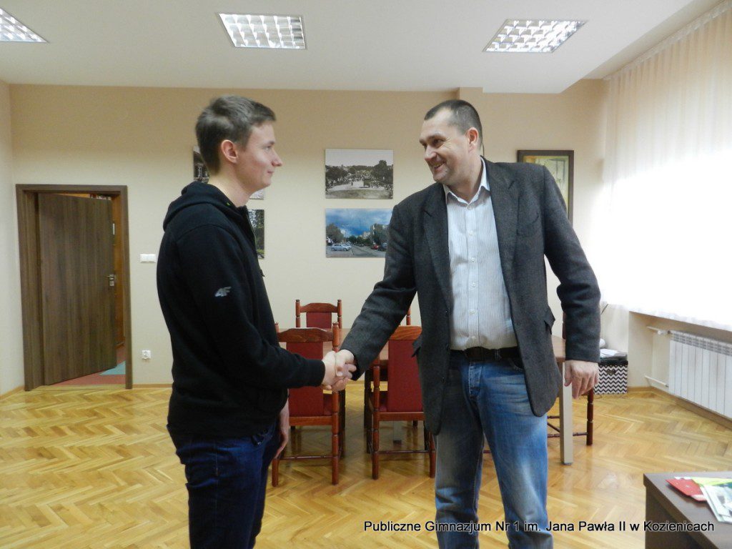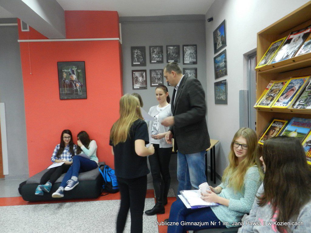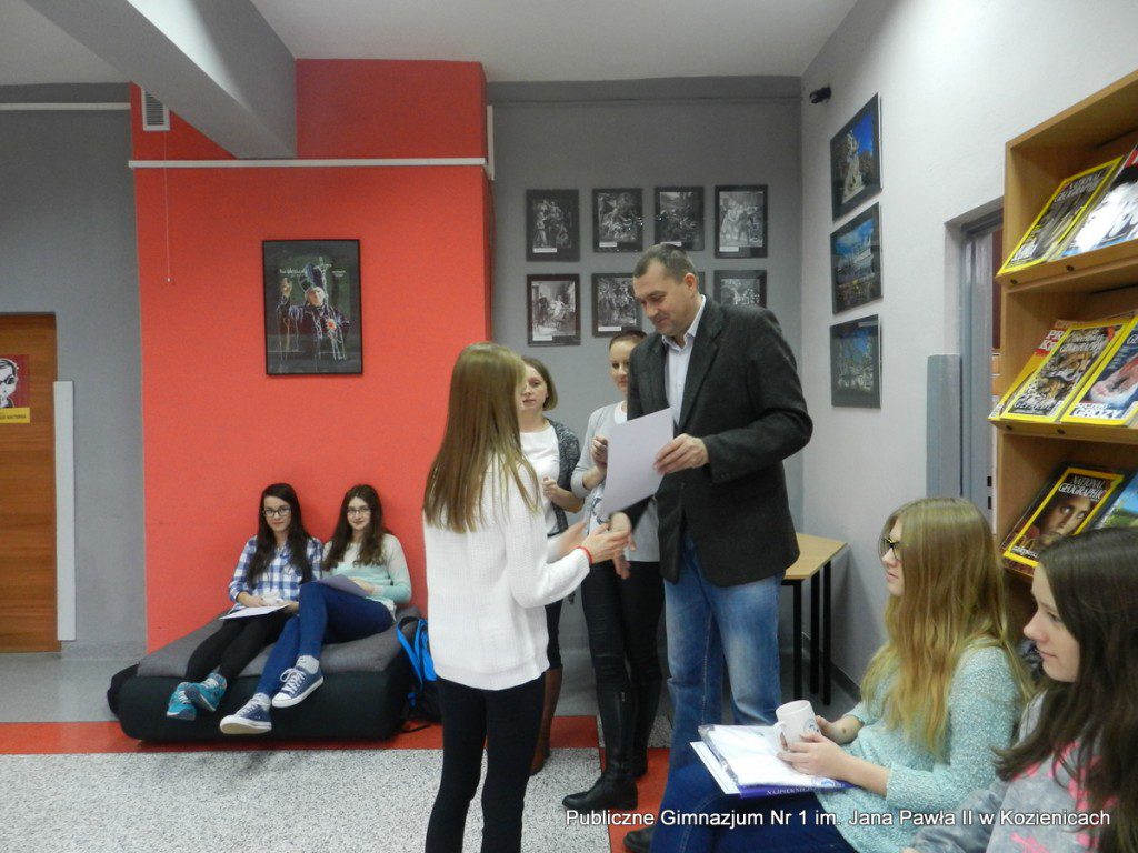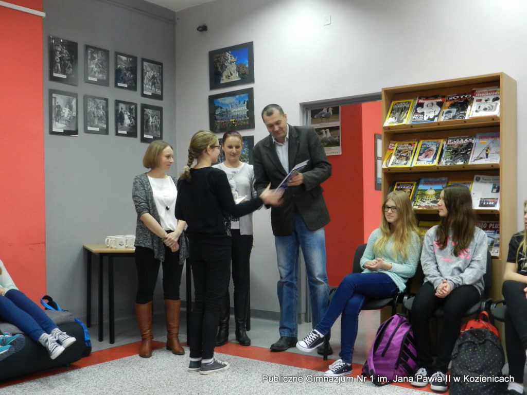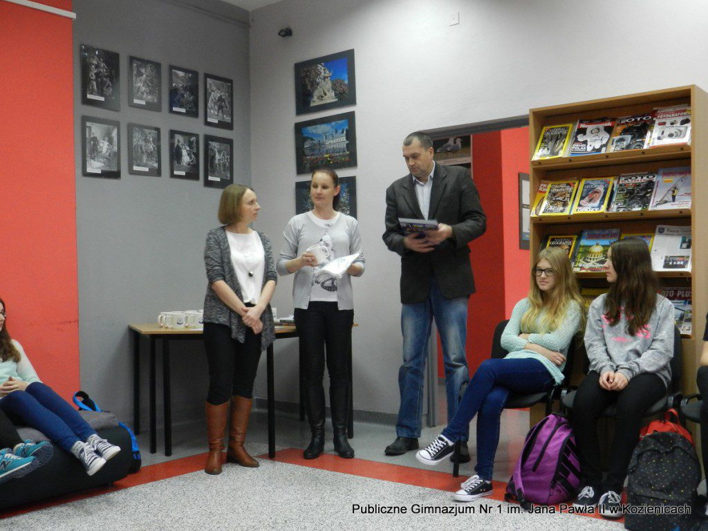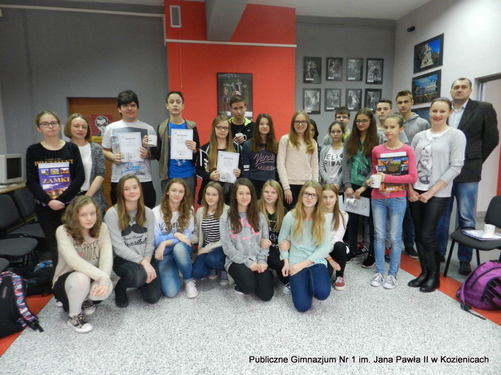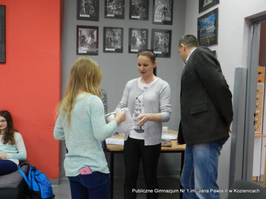 Nagrody wręczył zwycięzcom dyrektor Publicznego Gimnazjum Nr 1 im. Jana Pawła II w Kozienicach pan Tomasz Trela, wszystkim finalistom gratulował dobrych wyników i życzył dalszych sukcesów. Laureaci konkursu otrzymali pamiątkowe dyplomy, kubeczki z logo szkoły oraz nagrody książkowe i koszulki.