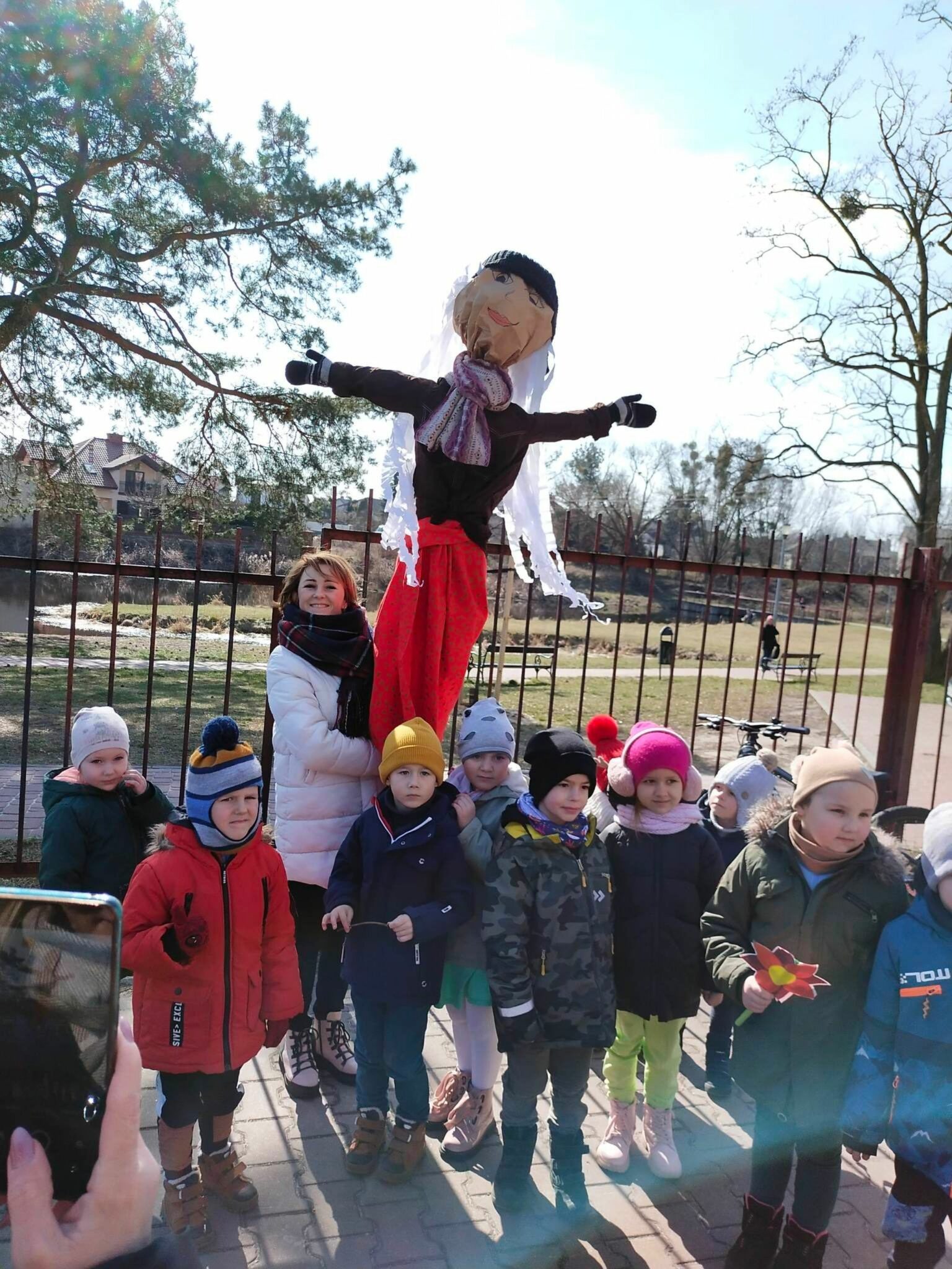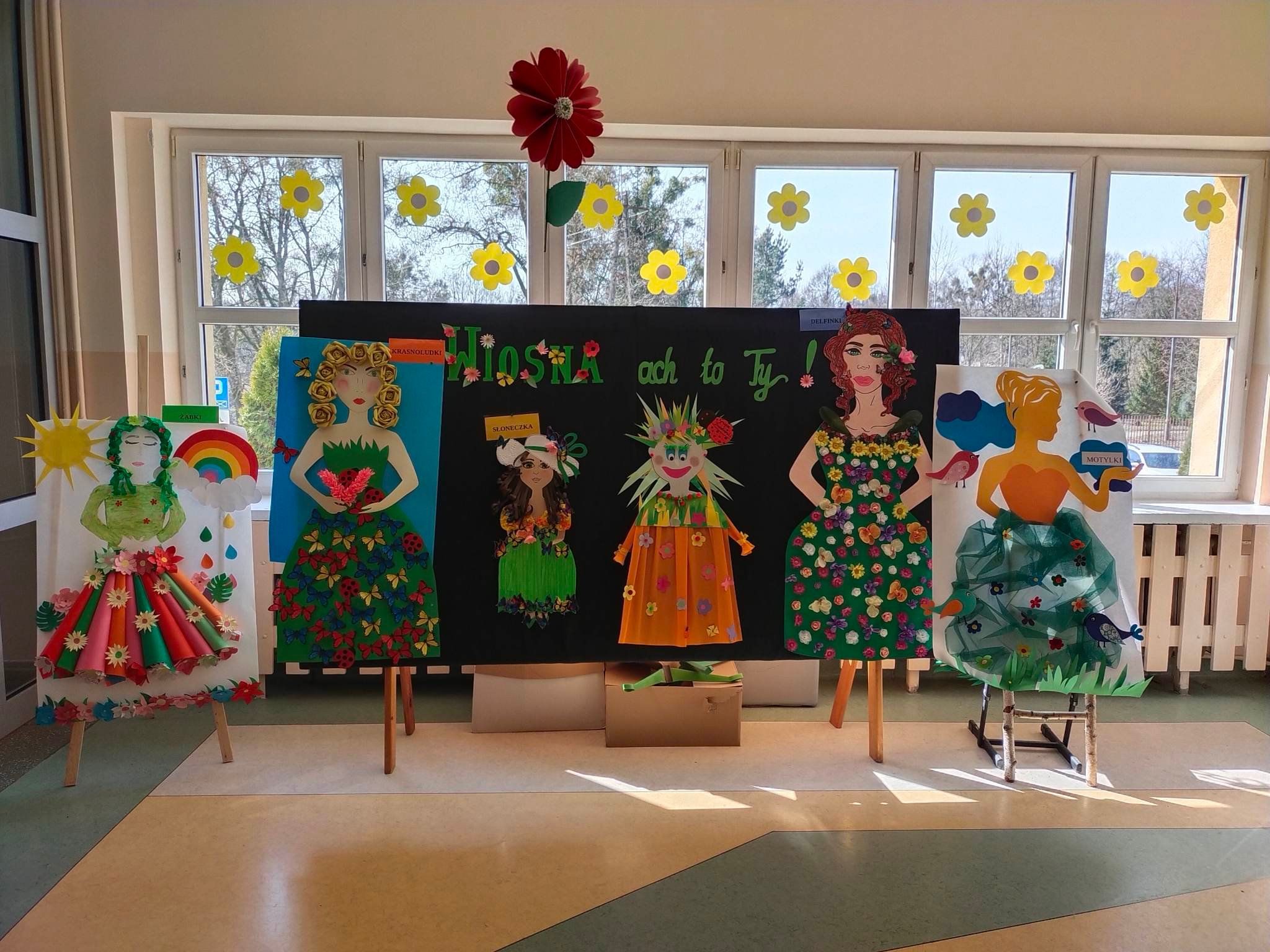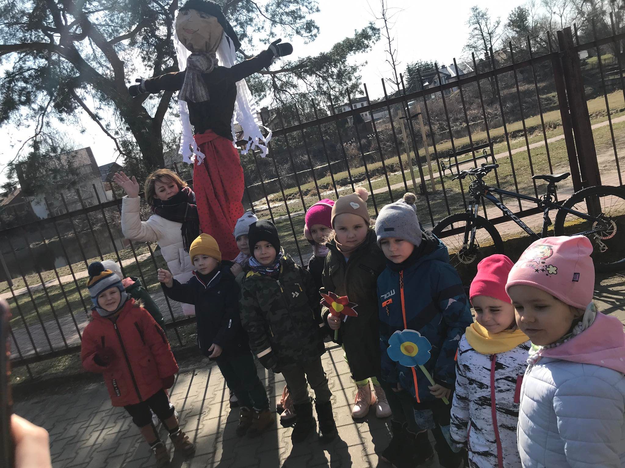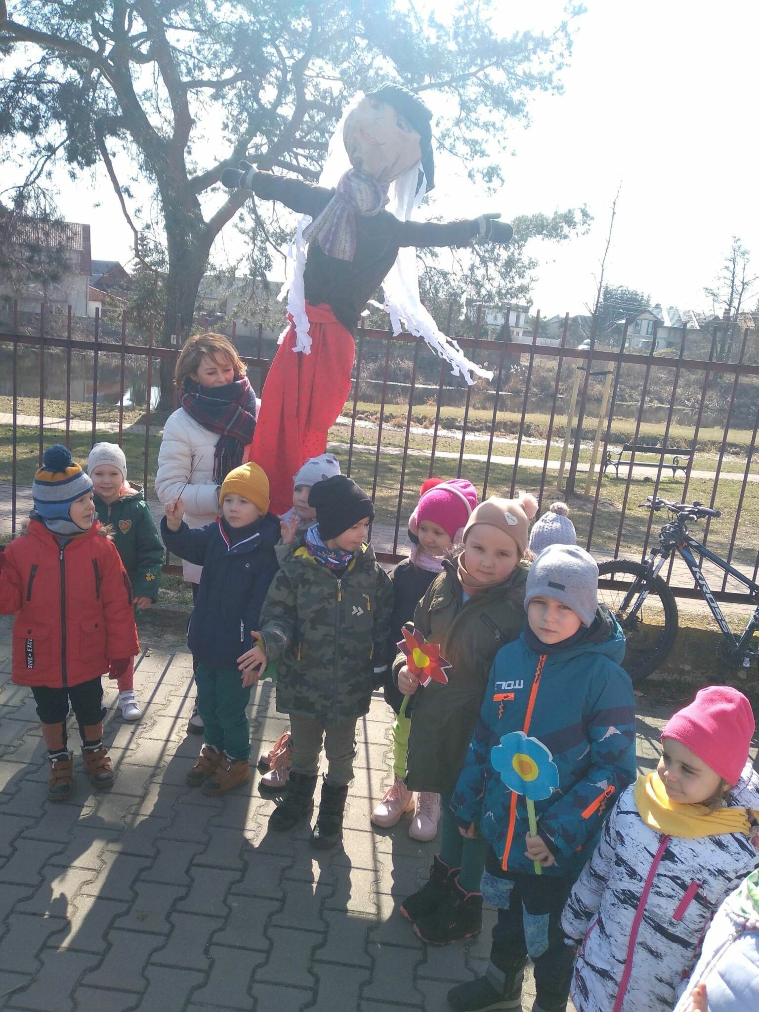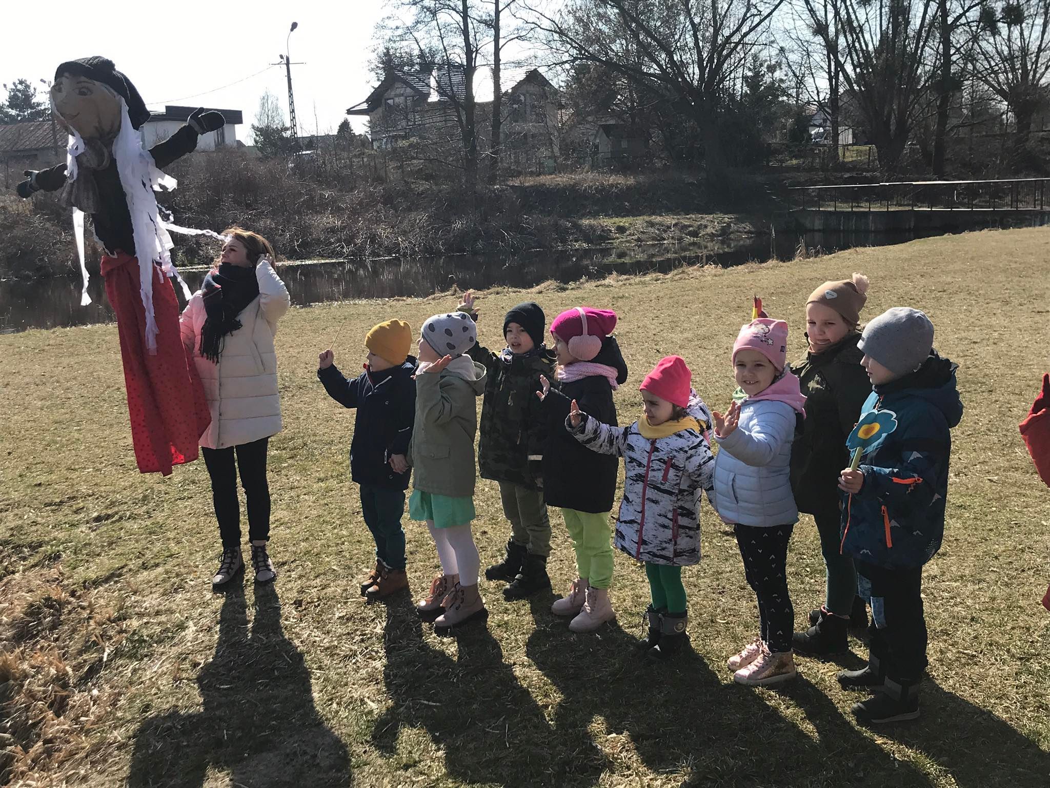 Każda grupa wykonała też przepiękną pracę plastyczną pt.: „Suknia Pani Wiosny”. Jednak największą atrakcją dla przedszkolaków był spacer po najbliższej okolicy z Panną Marzanną na czele. Wszystkie dzieci wyruszyły barwnym korowodem, śpiewając piosenki oraz trzymając wiosenne symbole.