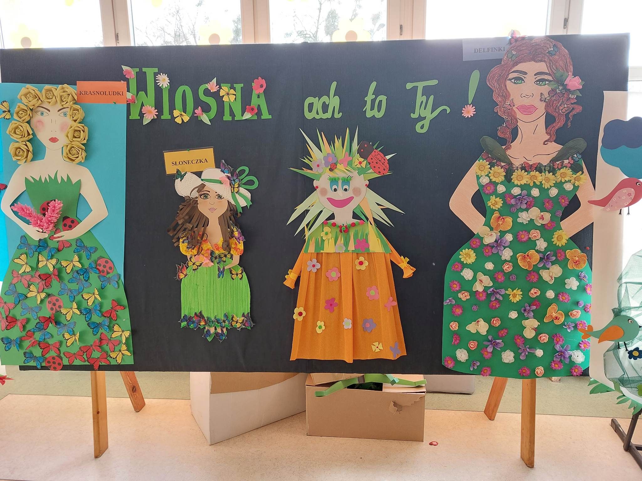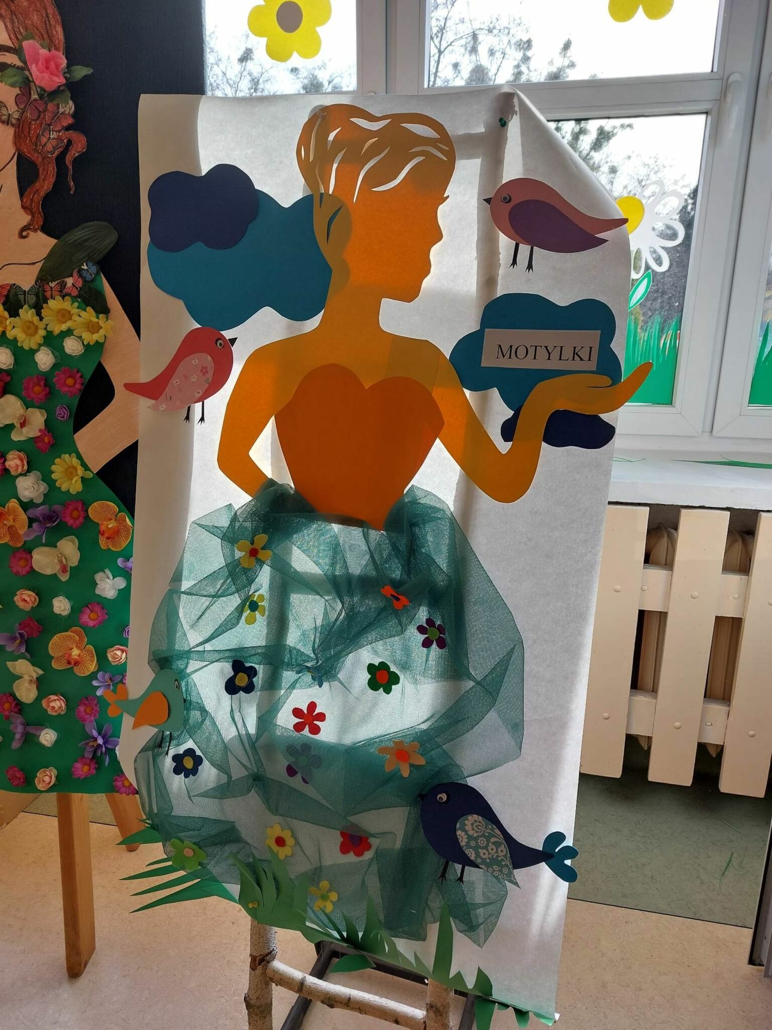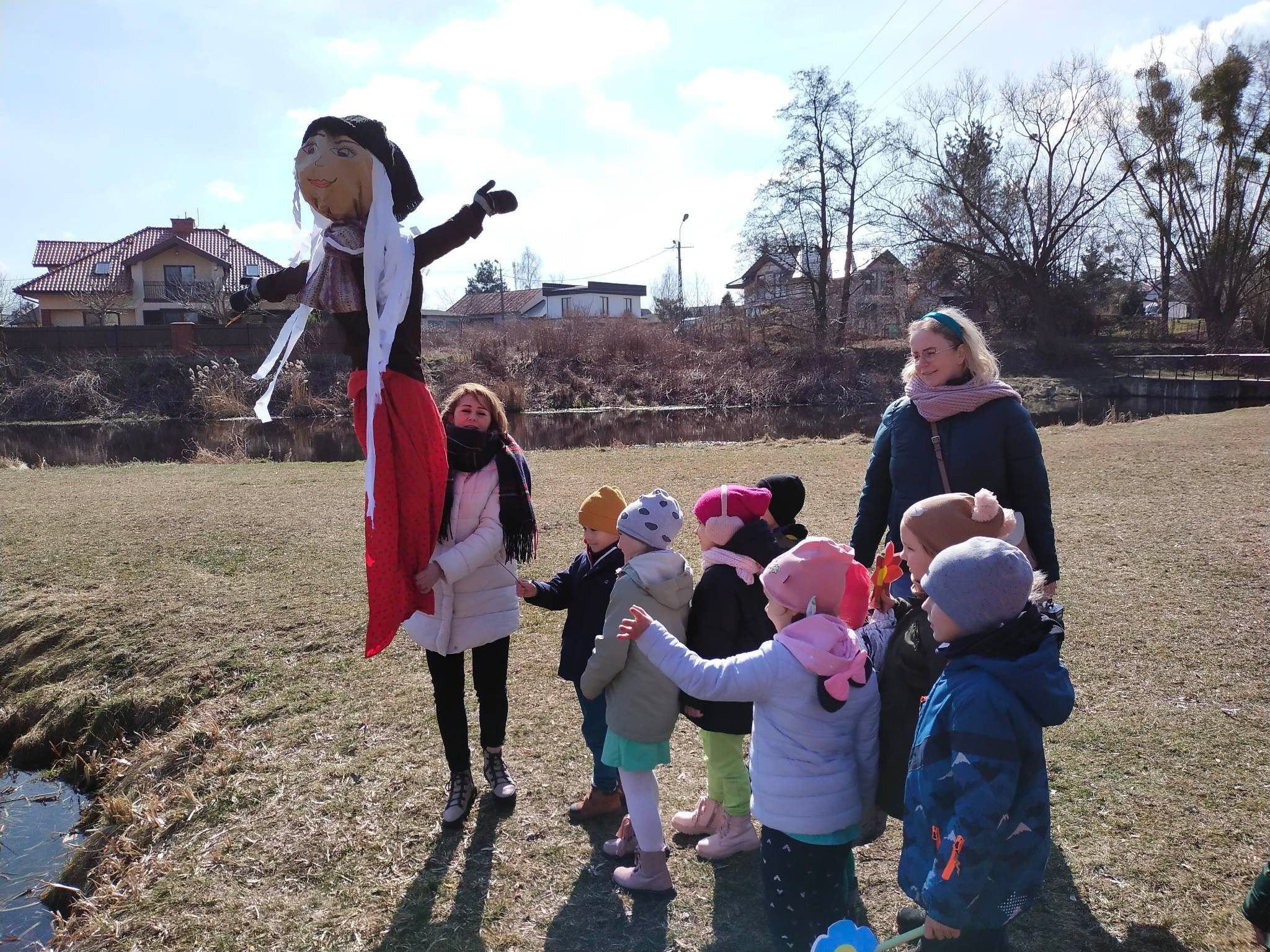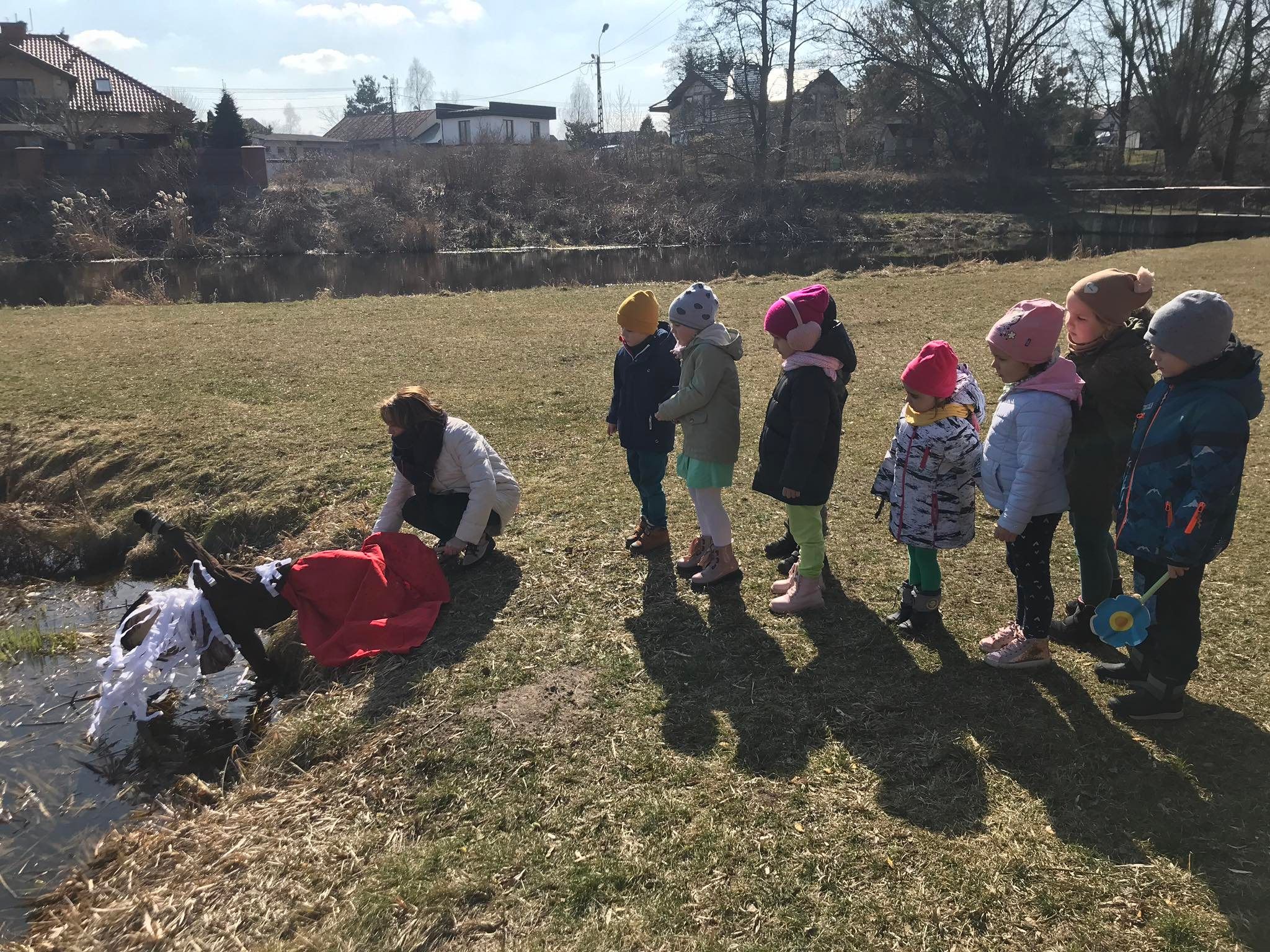 Każda grupa wykonała też przepiękną pracę plastyczną pt.: „Suknia Pani Wiosny”. Jednak największą atrakcją dla przedszkolaków był spacer po najbliższej okolicy z Panną Marzanną na czele. Wszystkie dzieci wyruszyły barwnym korowodem, śpiewając piosenki oraz trzymając wiosenne symbole.