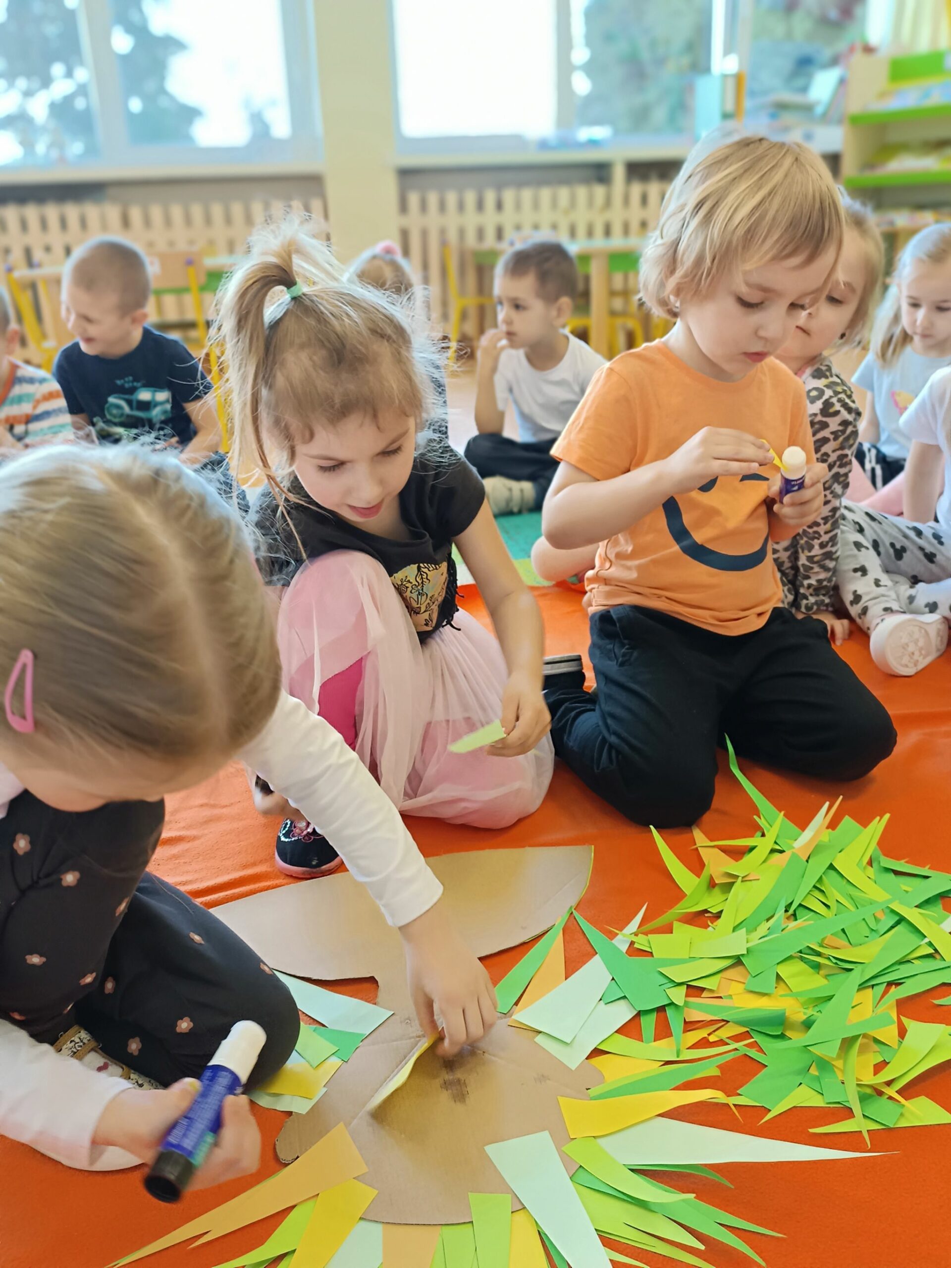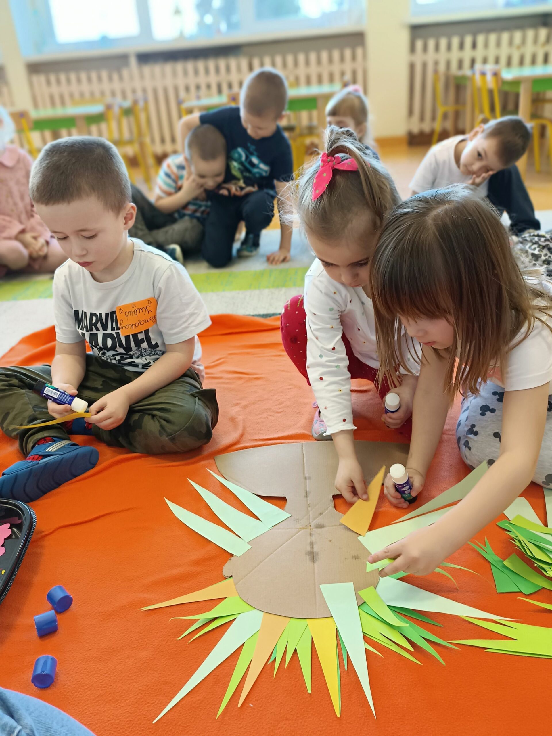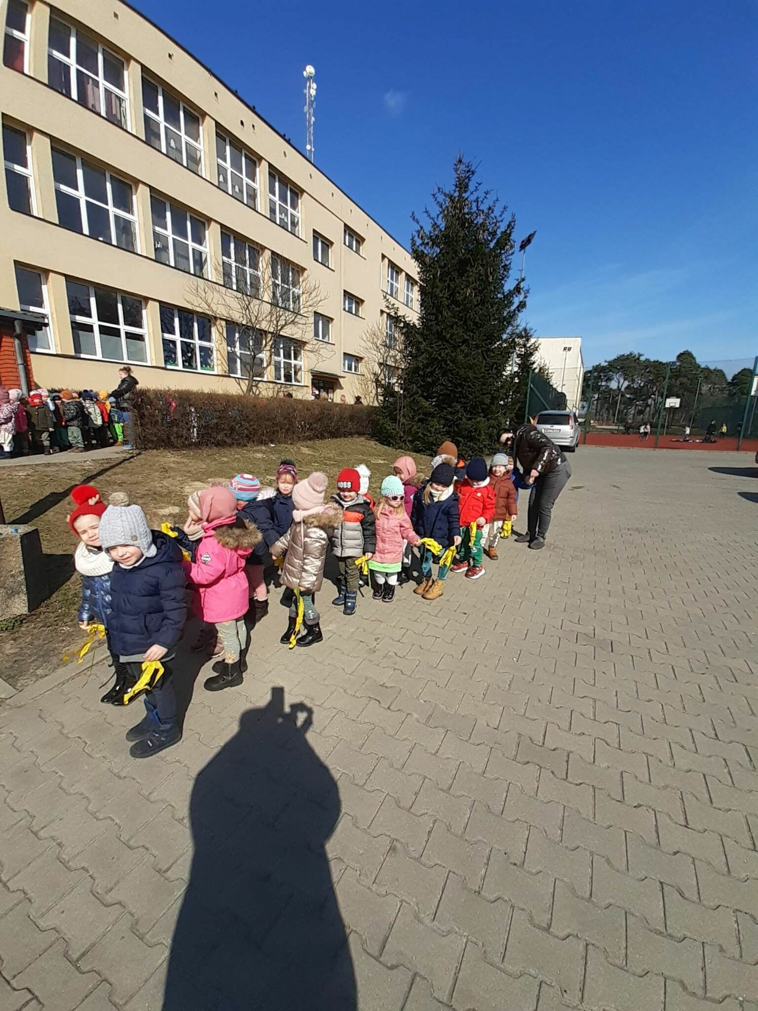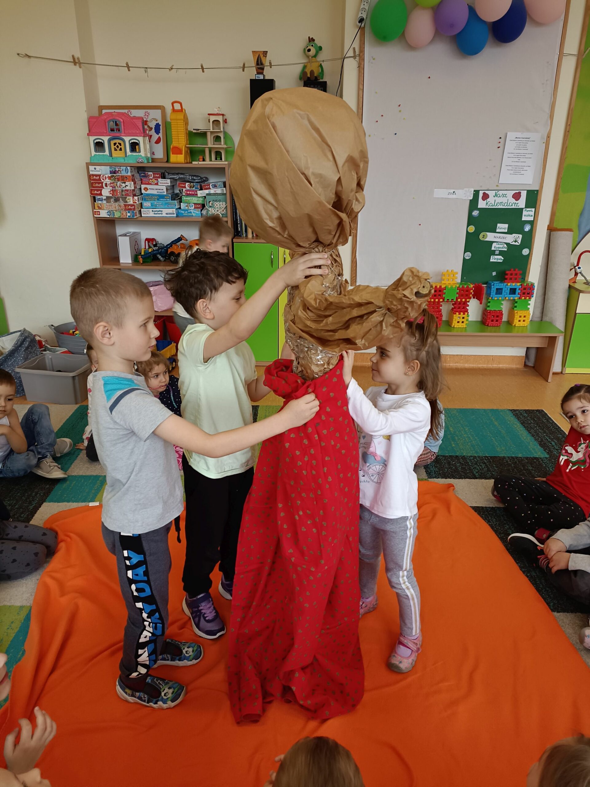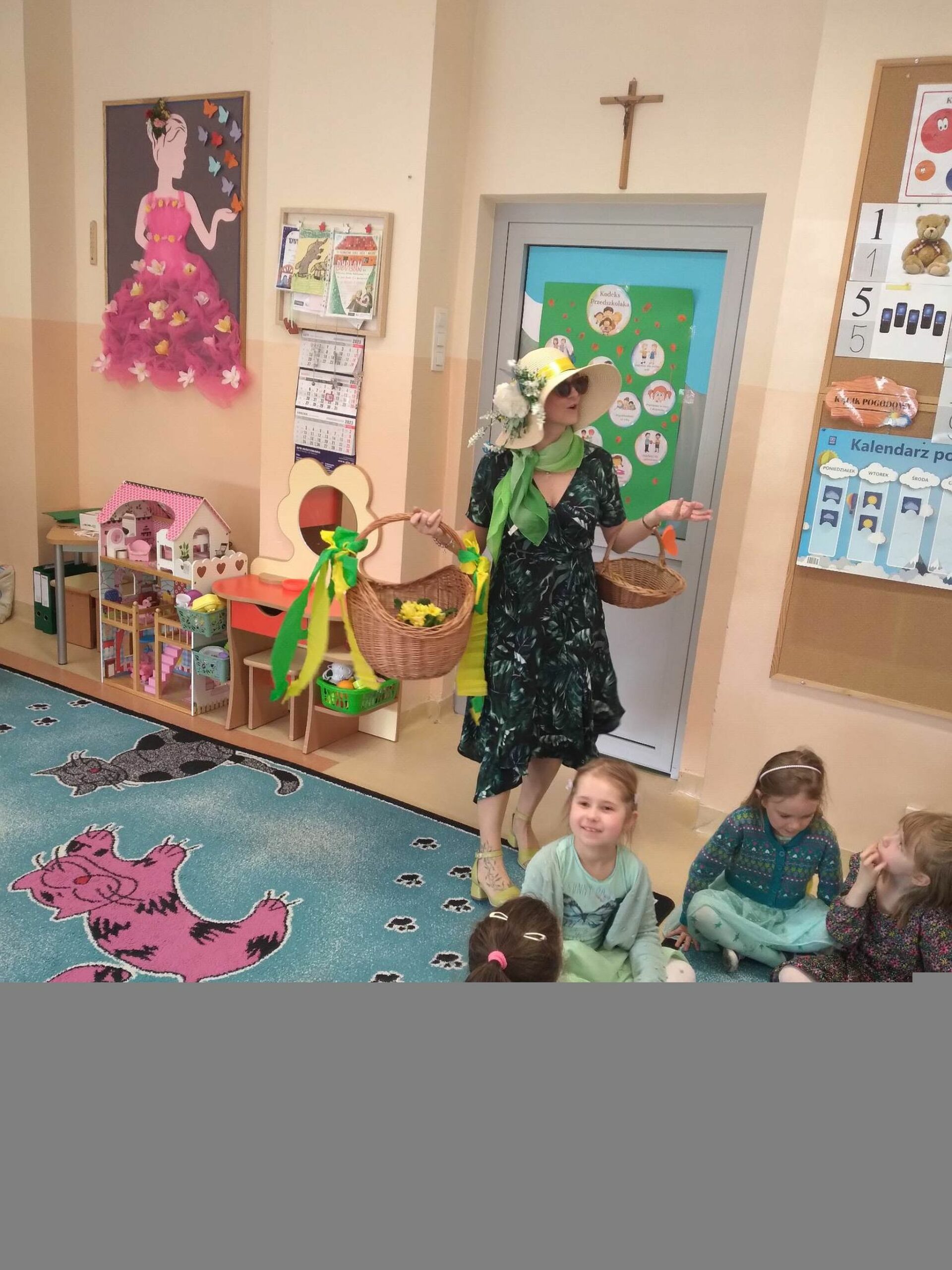 Każda grupa wykonała też przepiękną pracę plastyczną pt.: „Suknia Pani Wiosny”. Jednak największą atrakcją dla przedszkolaków był spacer po najbliższej okolicy z Panną Marzanną na czele. Wszystkie dzieci wyruszyły barwnym korowodem, śpiewając piosenki oraz trzymając wiosenne symbole.