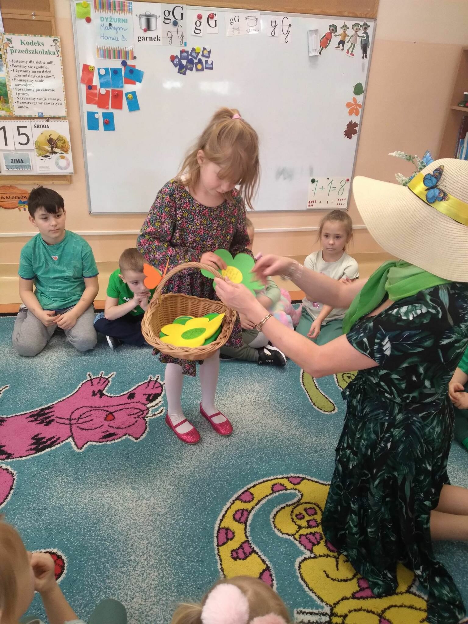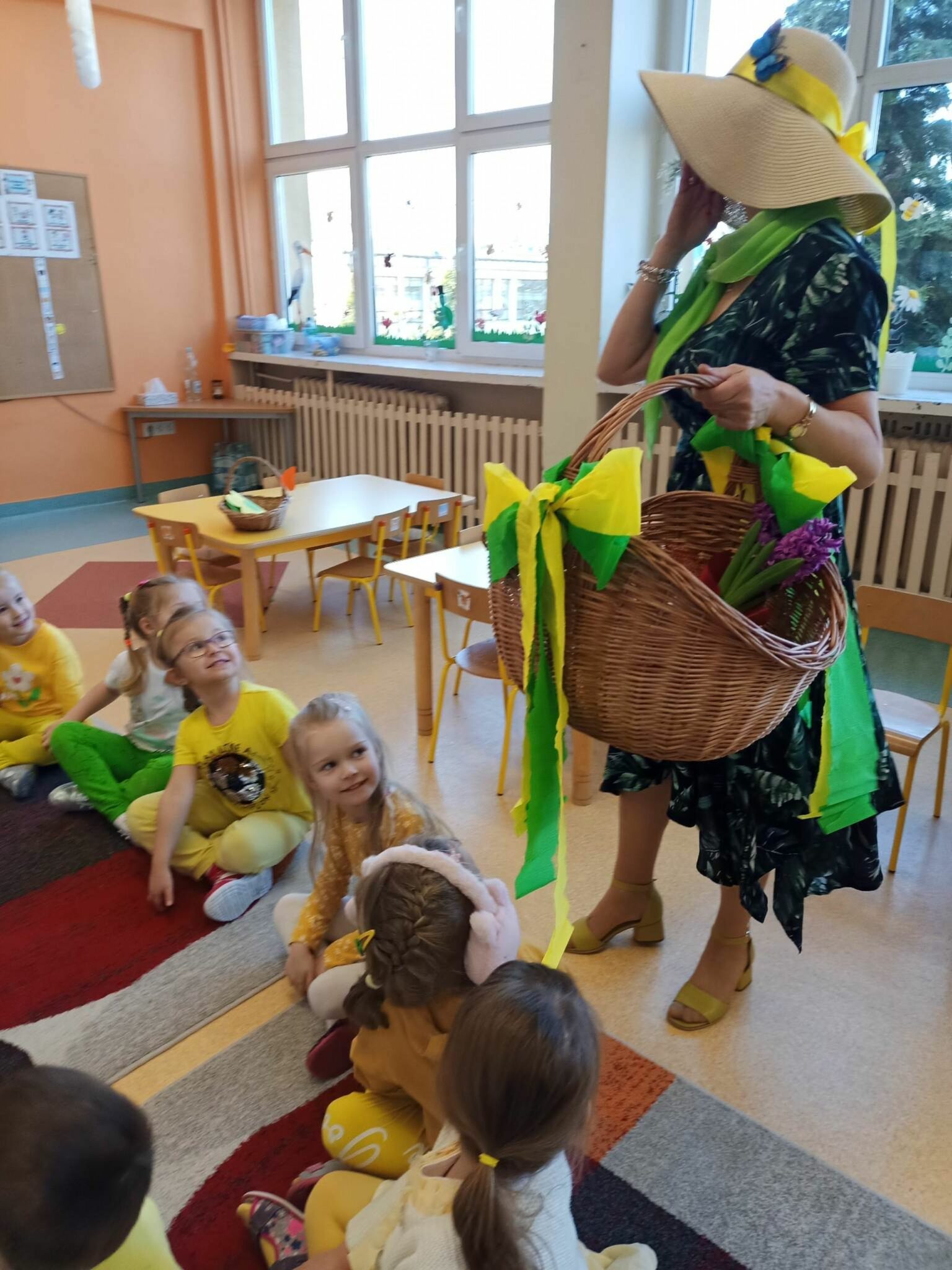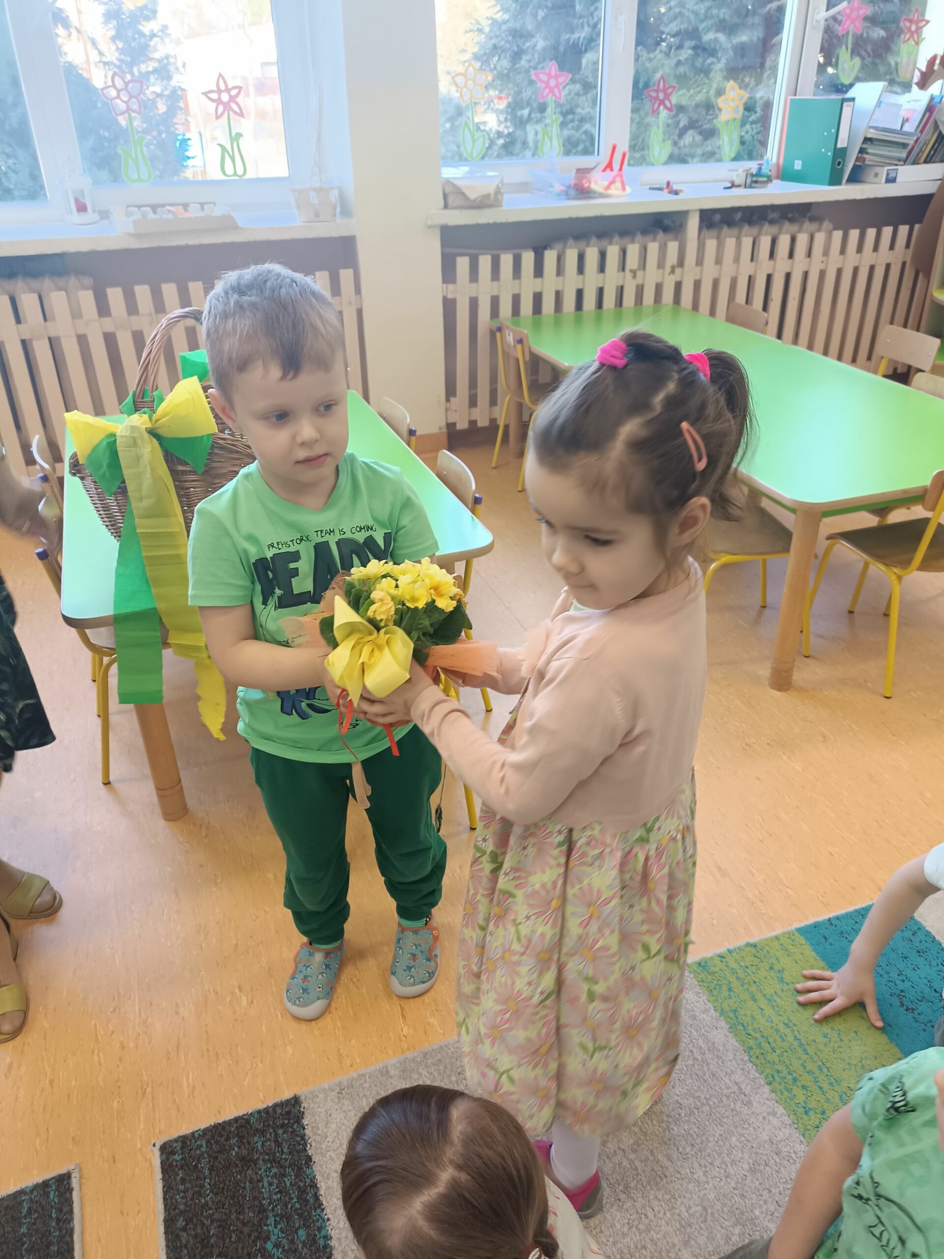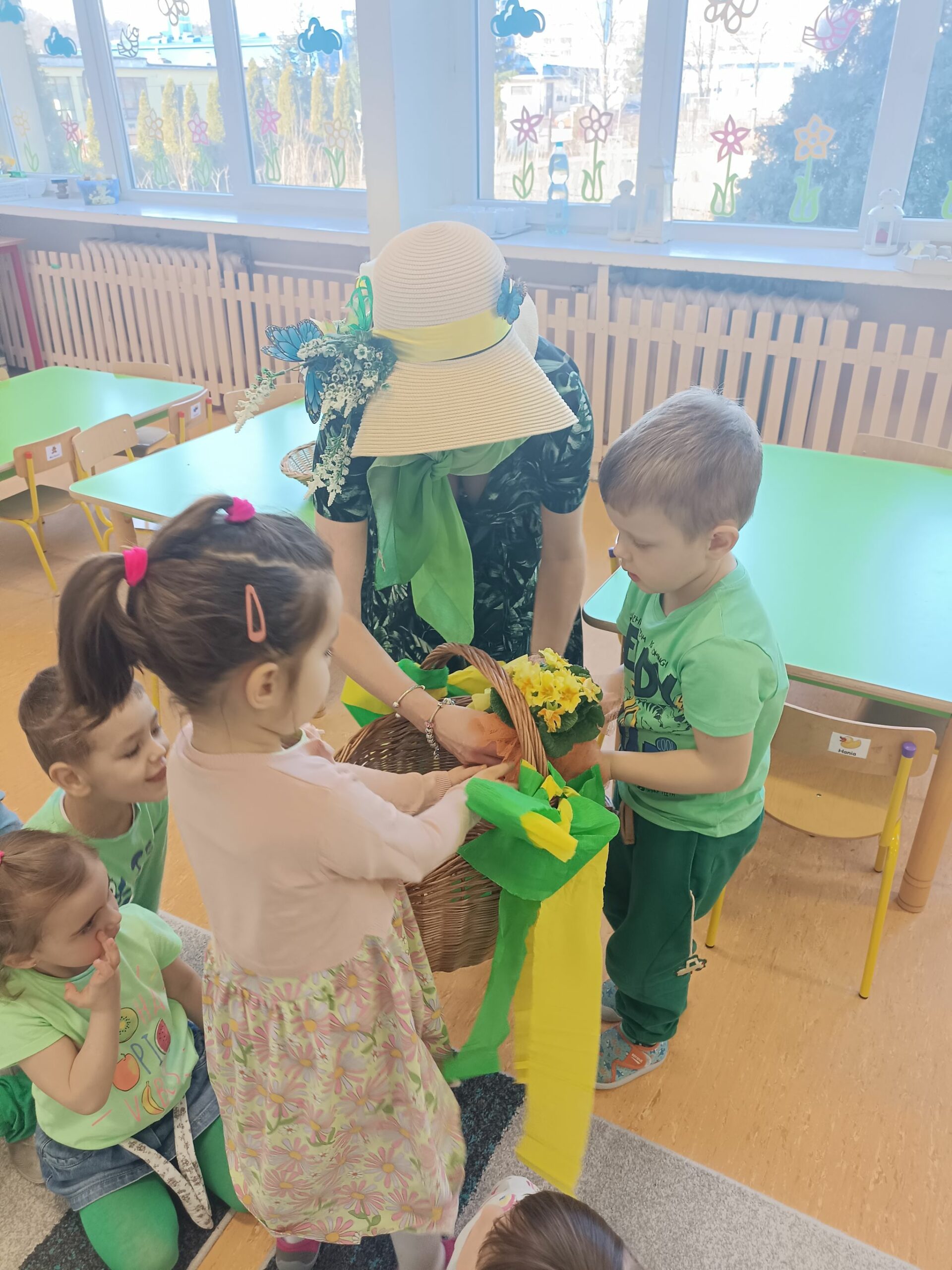 Pani Wiosna, odwiedzając każdą z grup, wręczała przepiękny kwiat, a dzieci chętnie rozwiązywały zagadki przez nią przygotowane. W tym dniu wszyscy bawili się doskonale. Dzieci recytowały piękne wiersze oraz śpiewały piosenki dla szacownego gościa.