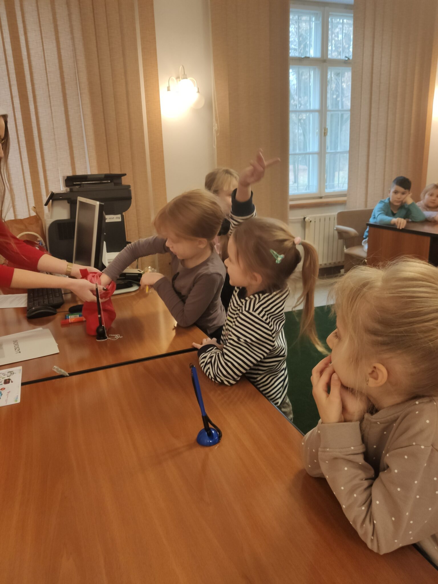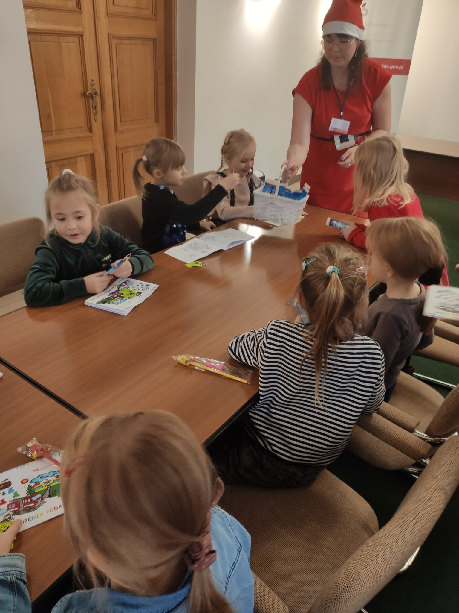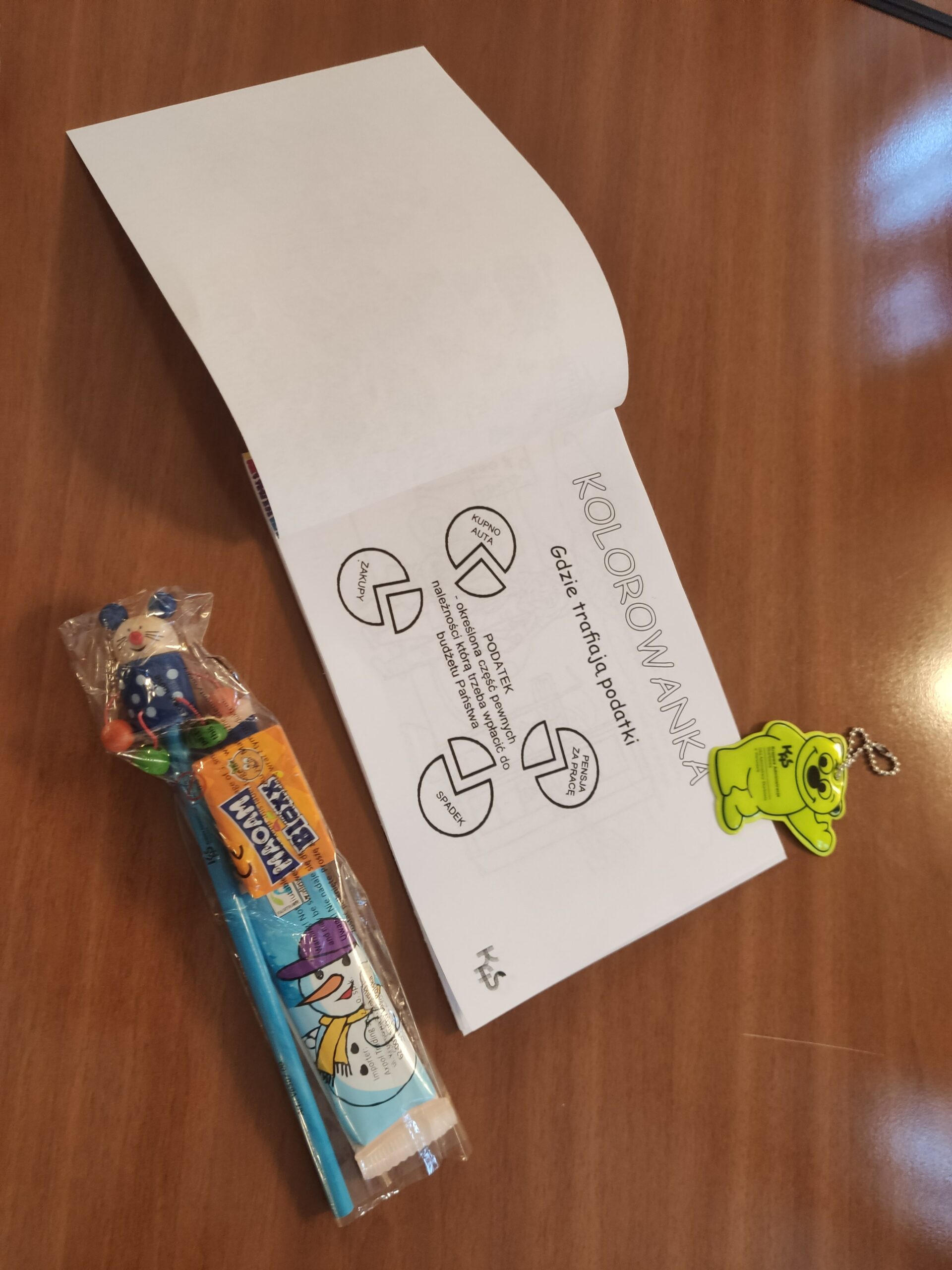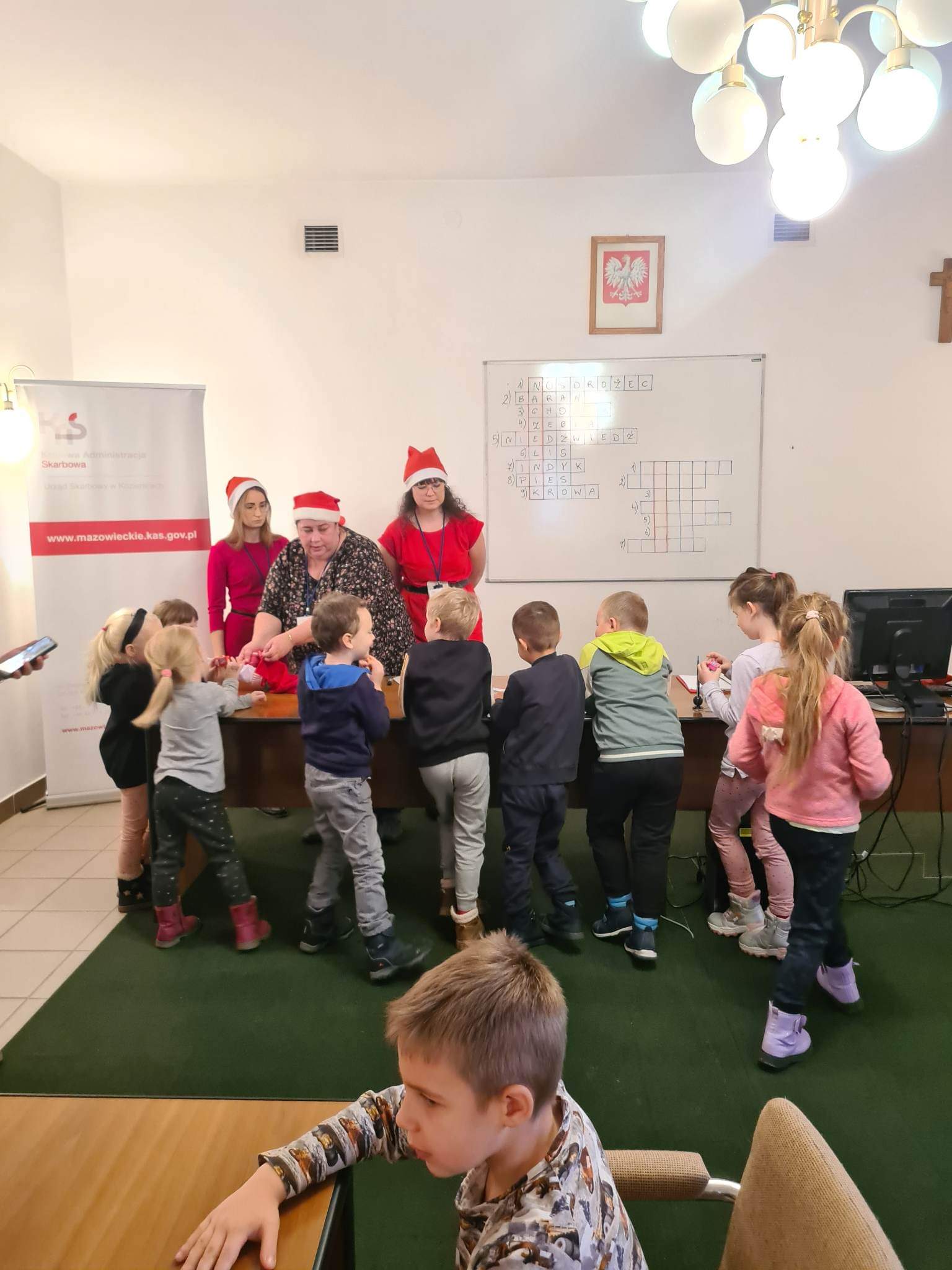 Dnia 9 grudnia dzieci z grupy Delfinki i Żabki wraz z wychowawczyniami odwiedziły Urząd Skarbowy. Wizyta miała na celu zapoznanie dzieci z organizacją administracji skarbowej. Podczas spotkania Panie prowadzące spotkanie w bardzo ciekawy sposób zapoznały dzieci z historią pieniądza, opowiedziały o urzędzie skarbowym, o sprawach, jakie można tu załatwić. Wspólnie podyskutowaliśmy o podatkach, dlaczego warto je płacić i na co są przeznaczane . Dzieci dowiedziały się , jaki wpływ mają podatki na finanse Państwa. Wszystko zostało opowiedziane sposób atrakcyjny dla przedszkolaków. Dzieci za czynny udział w spotkaniu , rozwiązywanie zagadek otrzymały kolorowanki oraz słodkie upominki.