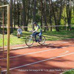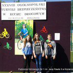 Nasze gimnazjum reprezentowało troje uczniów: Monika Paduch, Andżelika Wołos i Michał Rębiś – wszyscy z klasy 1d. Po wylosowaniu numerów startowych drużyny miały zmierzyć się z 3 zadaniami: pokonanie na rowerach specjalnego toru z przeszkodami, udzielenie pierwszej pomocy przedmedycznej oraz rozwiązanie testu zawierającego pytania z przepisów o ruchu drogowym. Po końcowym podsumowaniu punktów nasza drużyna zajęła 4 miejsce, uzyskując tyle samo punktów co 3 drużyna, lecz o kolejności zadecydowały punkty z testu teoretycznego w którym wypadliśmy nieco słabiej. Nad przygotowaniem drużyny do zawodów czuwał Jacek Wochniak.